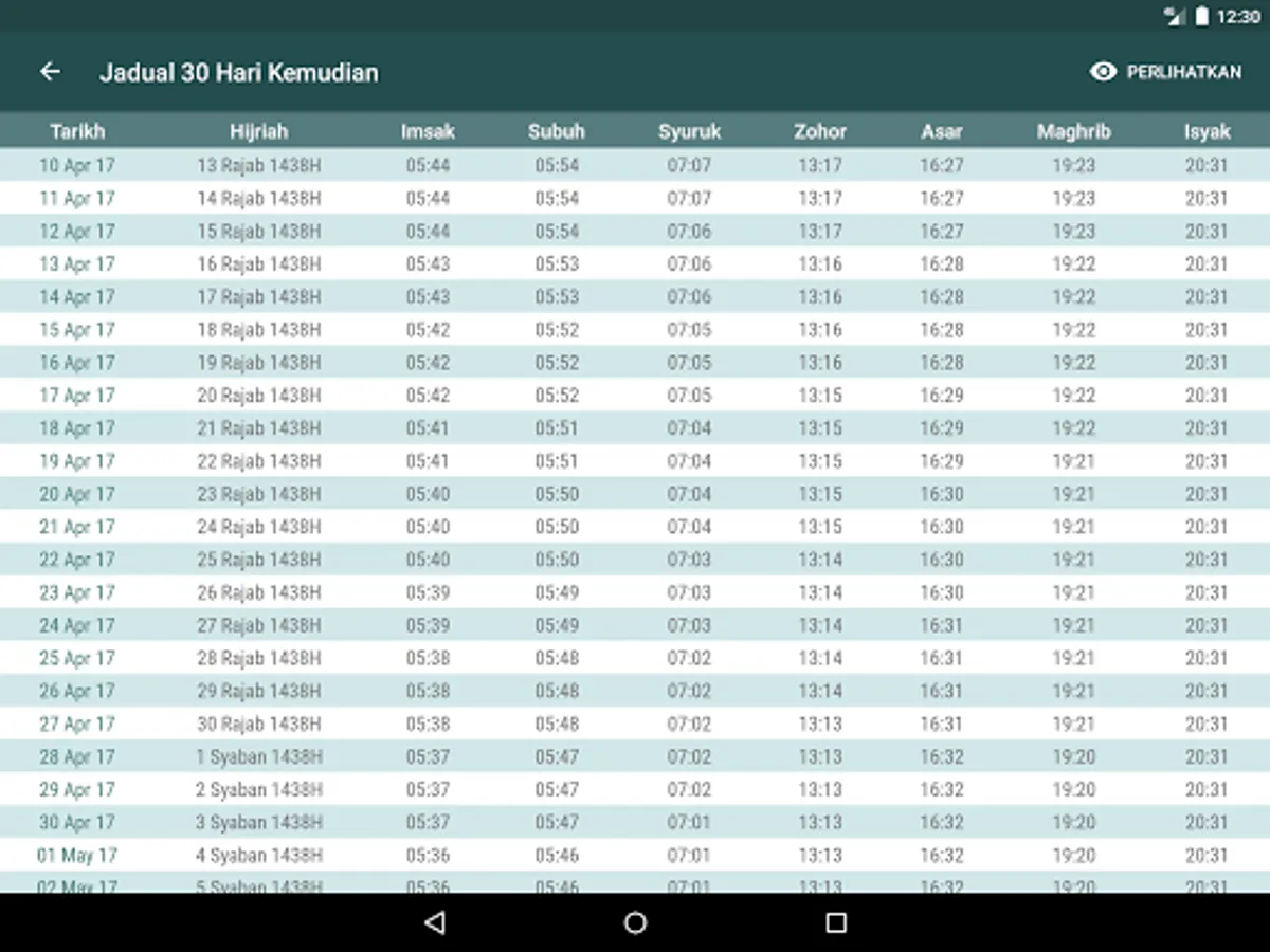 - Kalendar jadual solat dan Imsakiyah untuk 30 hari ke depan.
