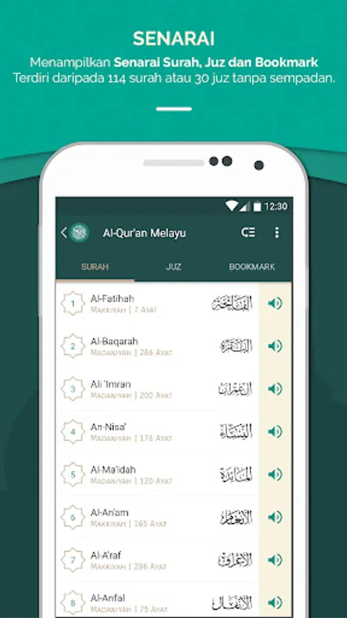 - Design yang menarik, menggeser skrin untuk berpindah surah atau juzuk.