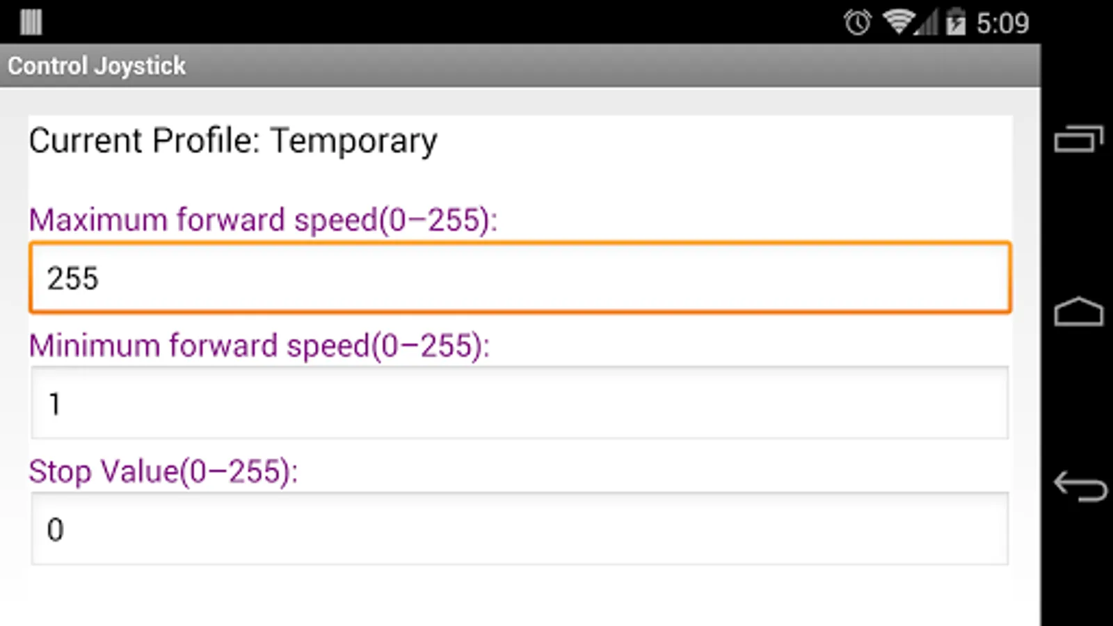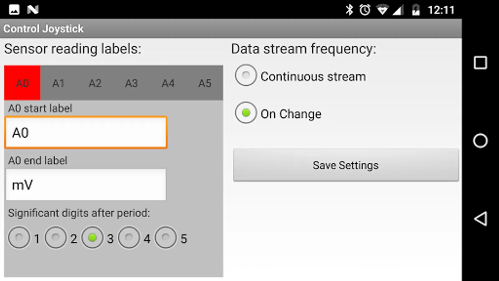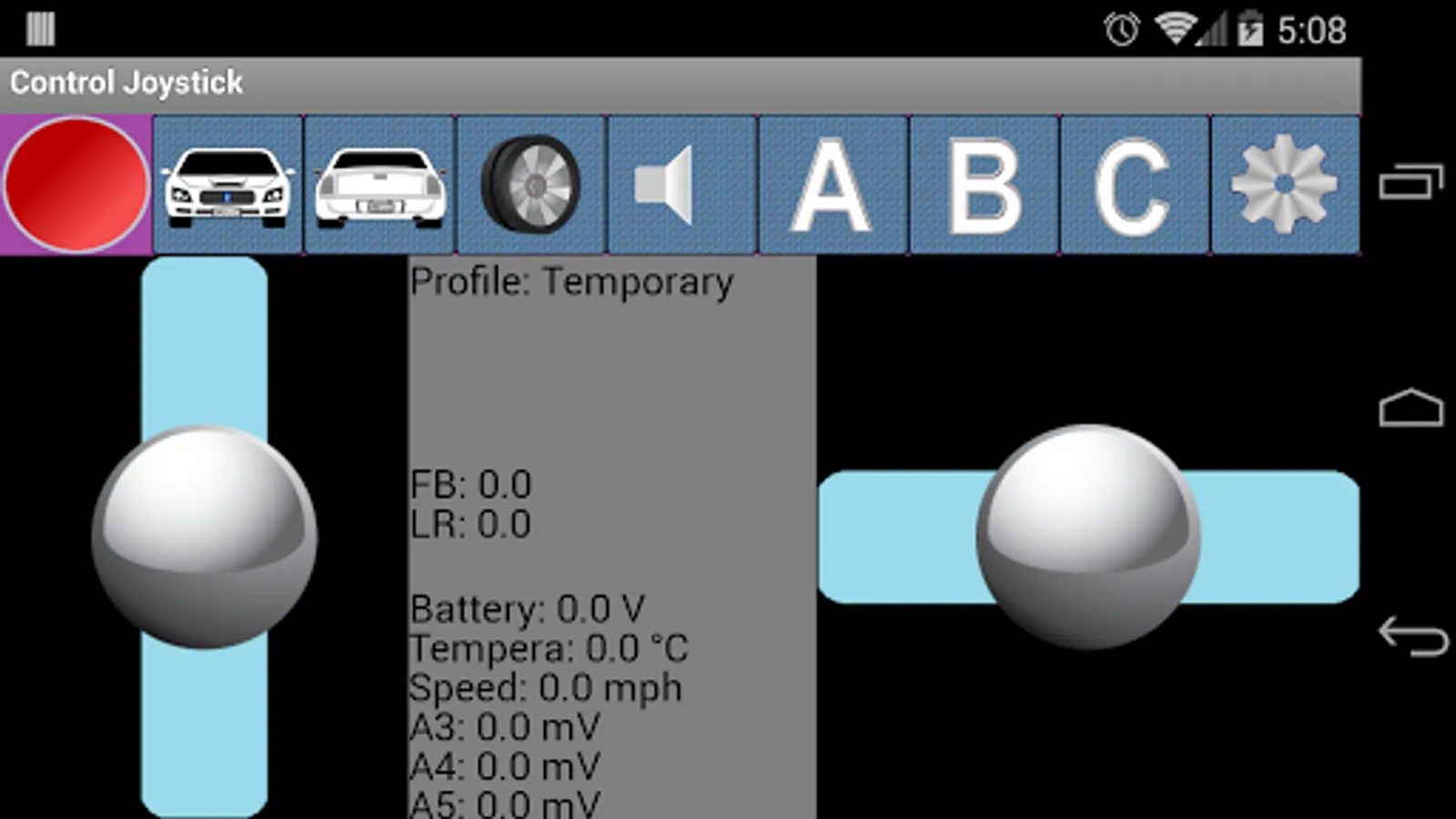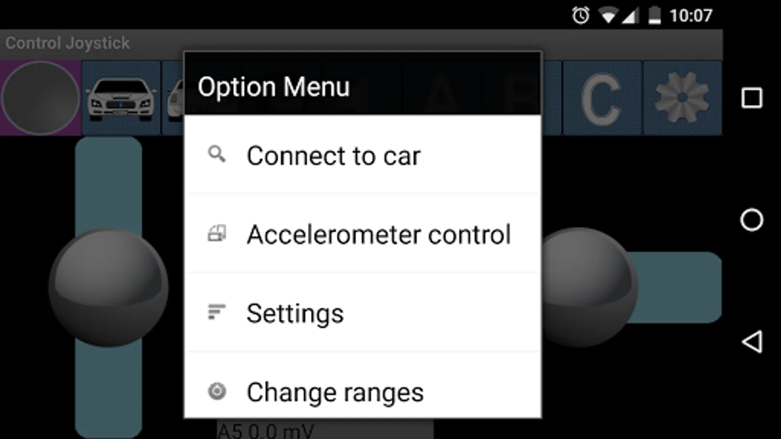 If you want to precisely control your Bluetooth enabled RC car, this application lets you do that. Composed of two joysticks, you can independently control the car's steering and speed. You can also set the steering and speed ranges from within the application. And in case you have more that one car, each one can have its one set of ranges. In case you have a tank, you can control its cannon by just toggling a button. And since the micro controller can read sensor values, the application is able to receive six independent readings. The first two are floating point readings, while the remaining four are a single byte long. The application sends a command every 50ms. This feature lets the car detect when it is out of range, in which case it'll stop before crashing.