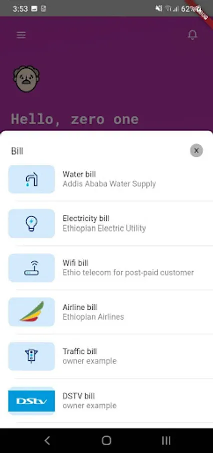 • Pay Bills such as water, electricity, Wi-fi, traffic bill, DSTV and many more to come...