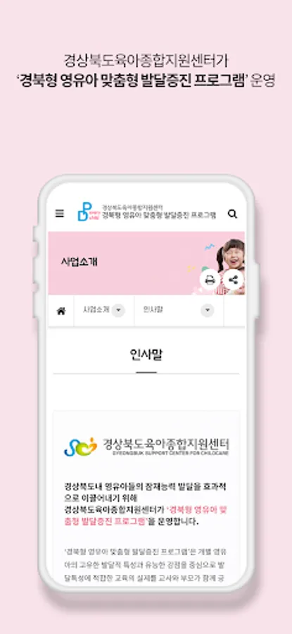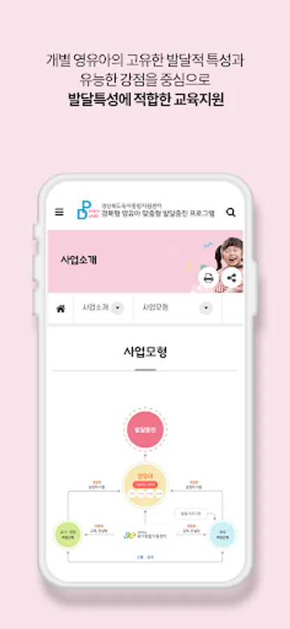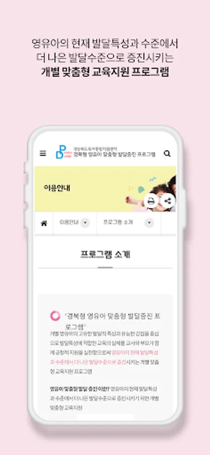 The 'Gyeongbuk-style developmental promotion program tailored to infants and young children' is based on the unique developmental characteristics and competent strengths of individual infants and young children, and teachers and parents together practice positive support for education suitable for developmental characteristics, thereby improving the current developmental characteristics and level of infants and young children. It is an individual customized education support program that promotes to a better level of development.