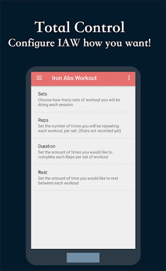 This app gives you the ability to customize your workout style, amount of reps, amount of sets, rest time and exercise duration.