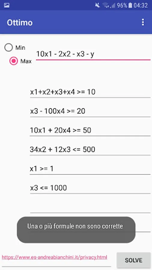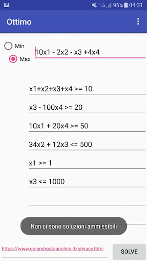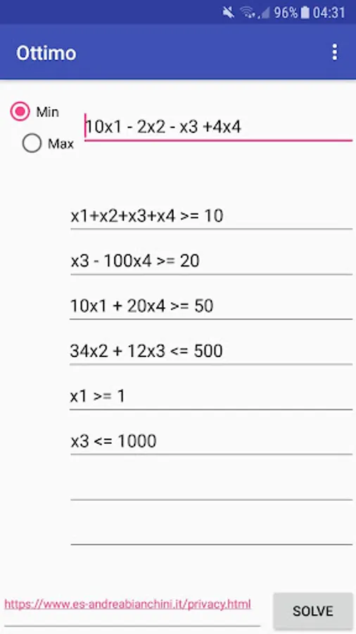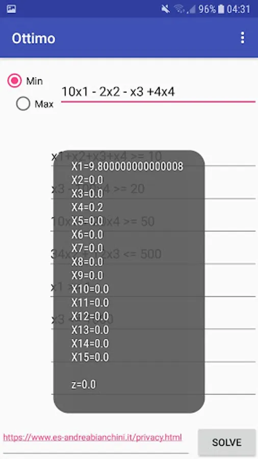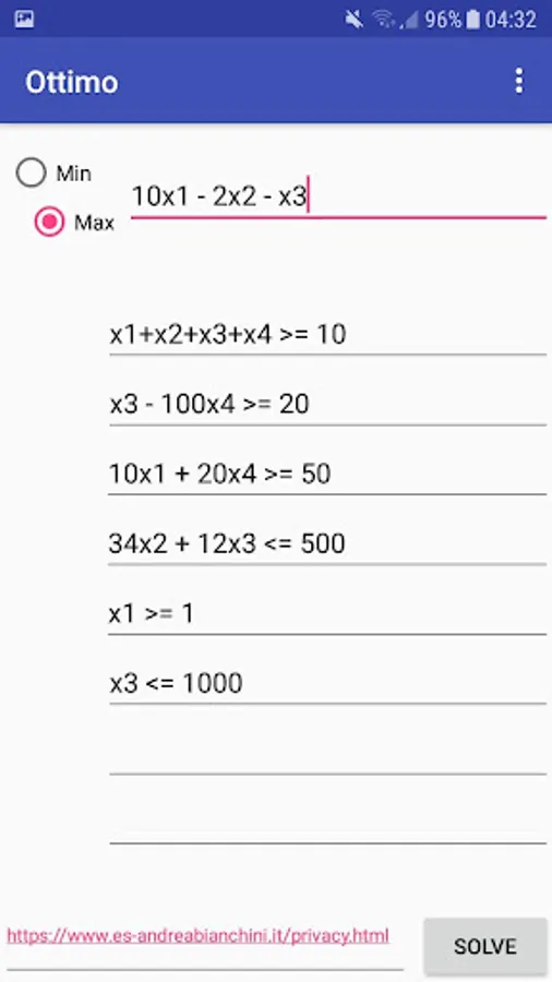 Ottimo is a demo programm and permit resolution of problems with max fifteen variables and eight constraints.