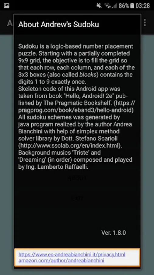 Sudoku game with three level of difficulty. All sudoku schemas were generated from a java application realized by the author. It is possible to play on hint modality, in such a case color of the cells will evidence where remains only a number to choice or where remains only few.