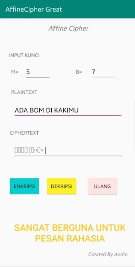 The Affine cipher method is an extension of the Caesar cipher method, which multiplies the plaintext with a P value and adds it with a shift b resulting in the C ciphertext expressed by congruent functions: