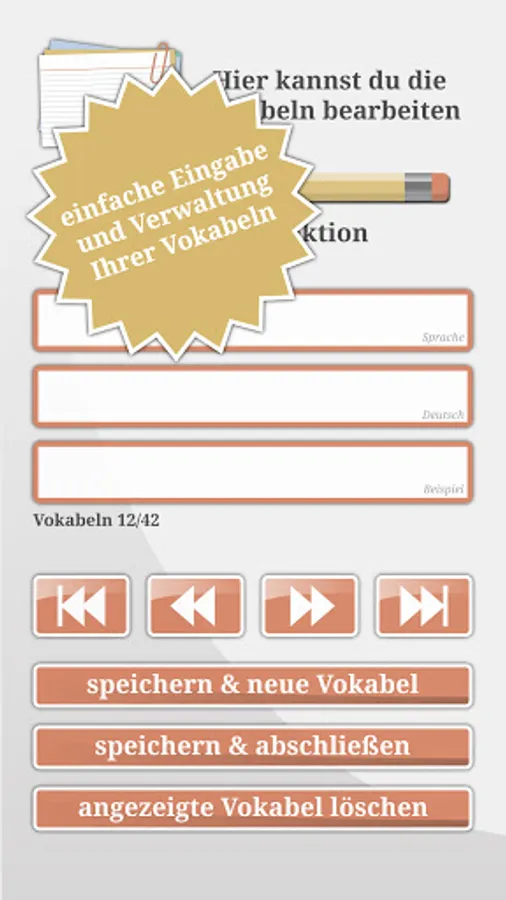 With our vocabulary trainer you can quickly and easily enter, sort and manage all the vocabulary in a textbook or course. You can create individual languages, folders and lessons to your heart's content, name them and fill them with vocabulary. The informative statistics tool also gives you a quick overview of your data. Of course you can also use the CSV import here!