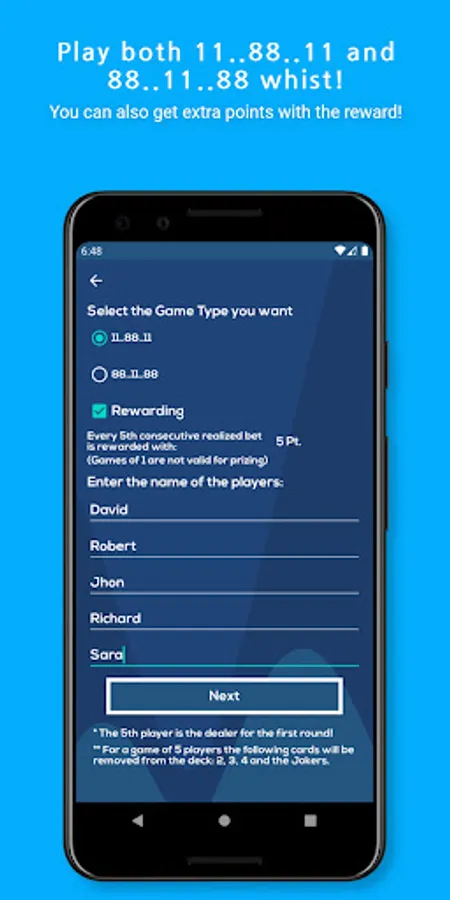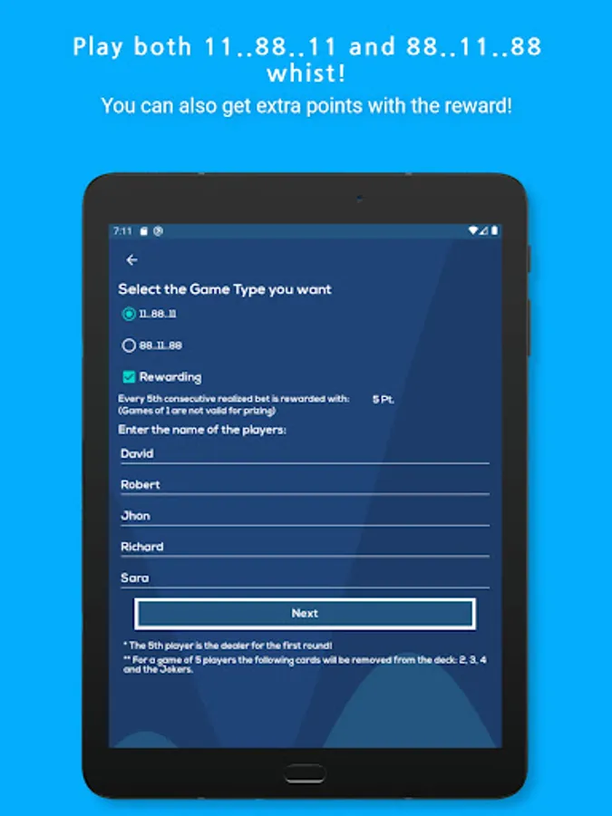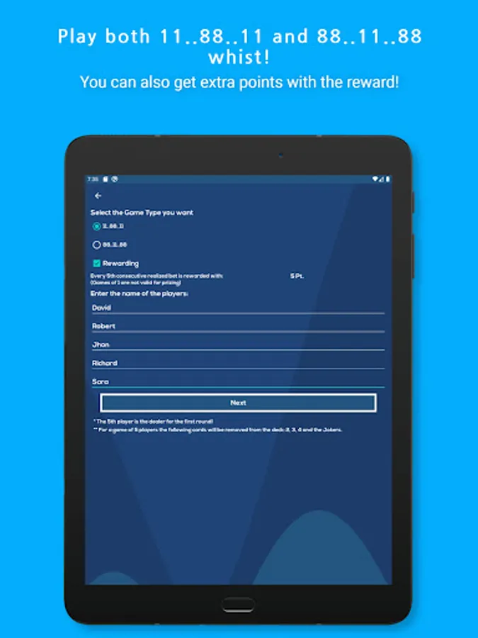 The Whist game can be played in both 11..88..11 type and 88..11..88, and includes the option of prizing players based on their results.