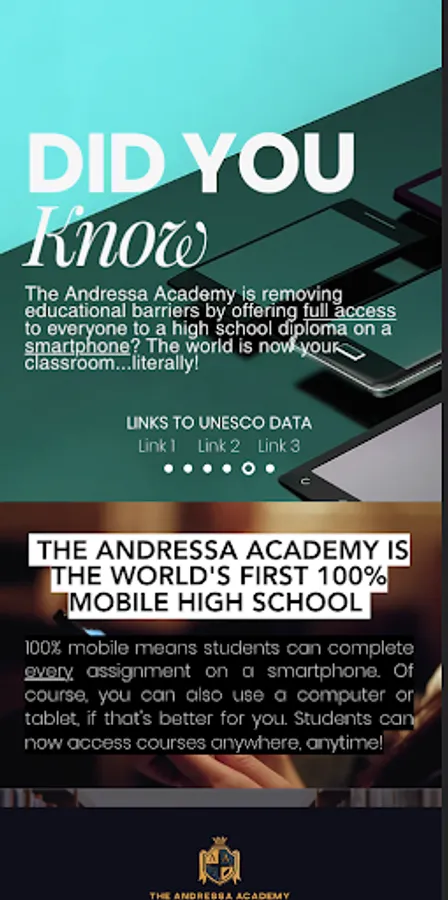 The Andressa Academy is a 100% mobile high school providing tuition-free education worldwide. 100% mobile means students can complete every assignment on a smartphone. Of course, students can also use a computer or tablet if that's better for them. Students can now access courses anywhere, anytime!