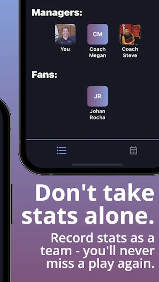 Parents and fans can download Stat Together to view the team's record and stats. Unlike other apps, you can add as many fans as you'd like, completely free! Team Fans cannot edit any stats or results - only view.