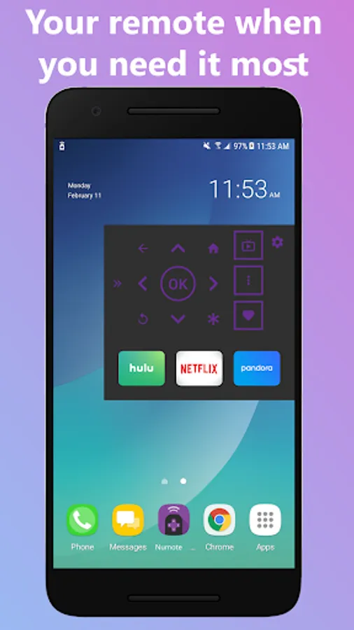 Numote - Remote for Roku is an innovative new free Roku remote app that floats on the side of your screen until you need it. No more interrupting what you're doing just to let Netflix know you're still watching - just tap the widget and your remote is there π. Numote - Remote for Roku works on any Roku streaming device, whether its a TV, streaming stick, or a box.