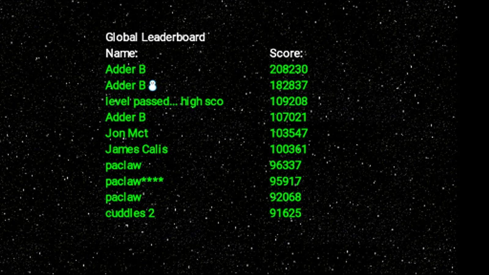 You can compete for points against yourself and others or try to get to the last level. Ah, but what if you keep dying and cannot get to the next level? We have thought of that: you can not die! You can, however fail to get to the next level. If your score is negative then you are not permitted to go to the next level. It's an imperfect system but we like it.