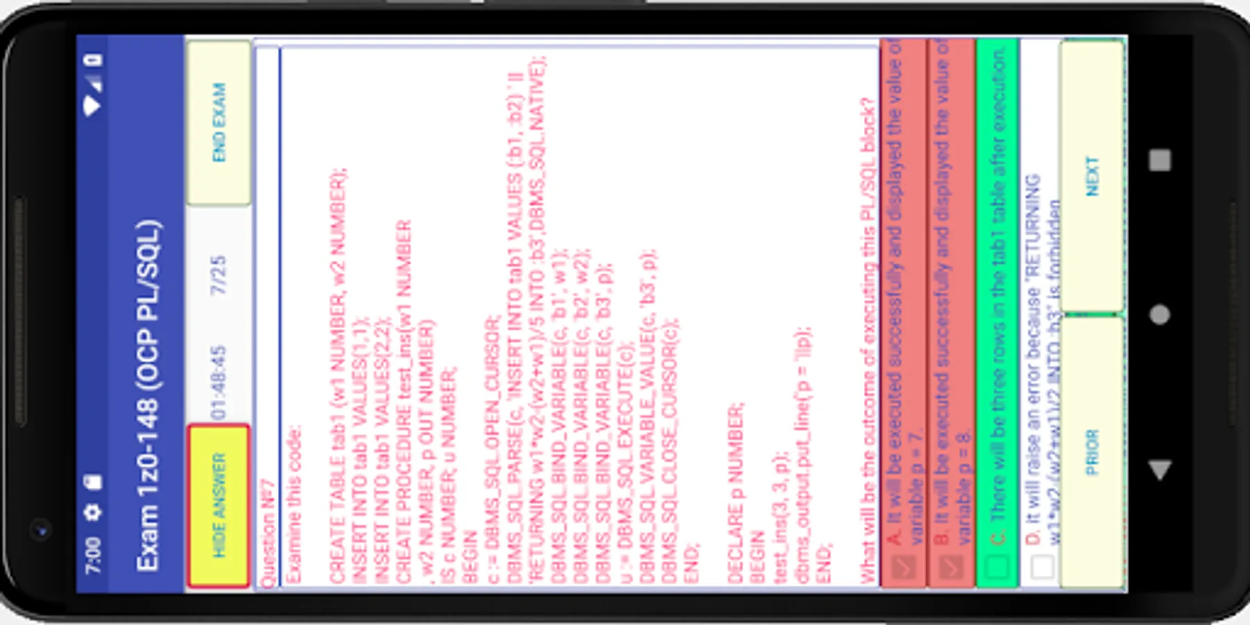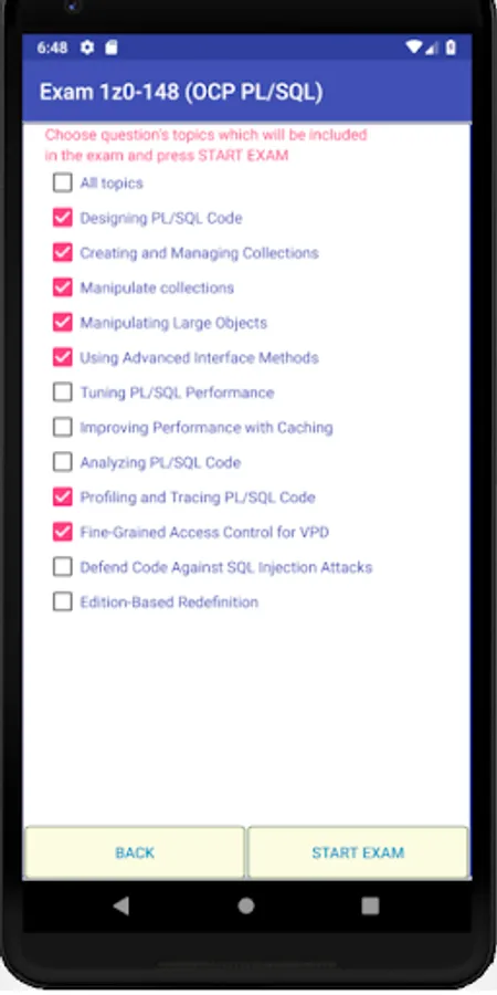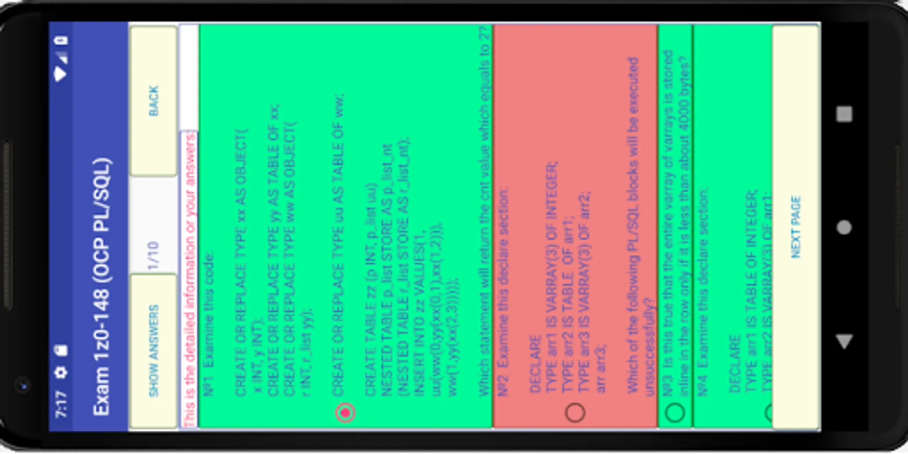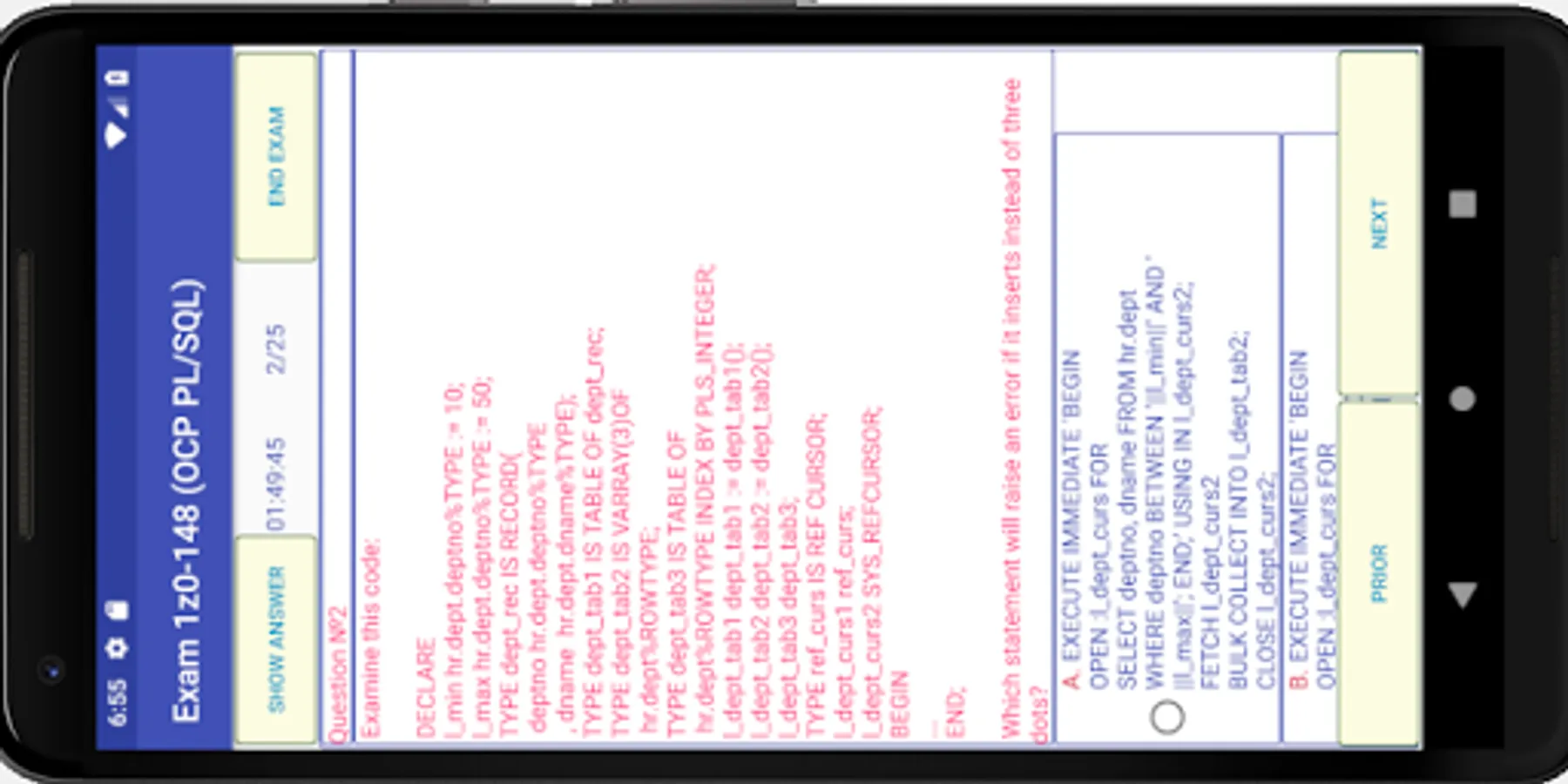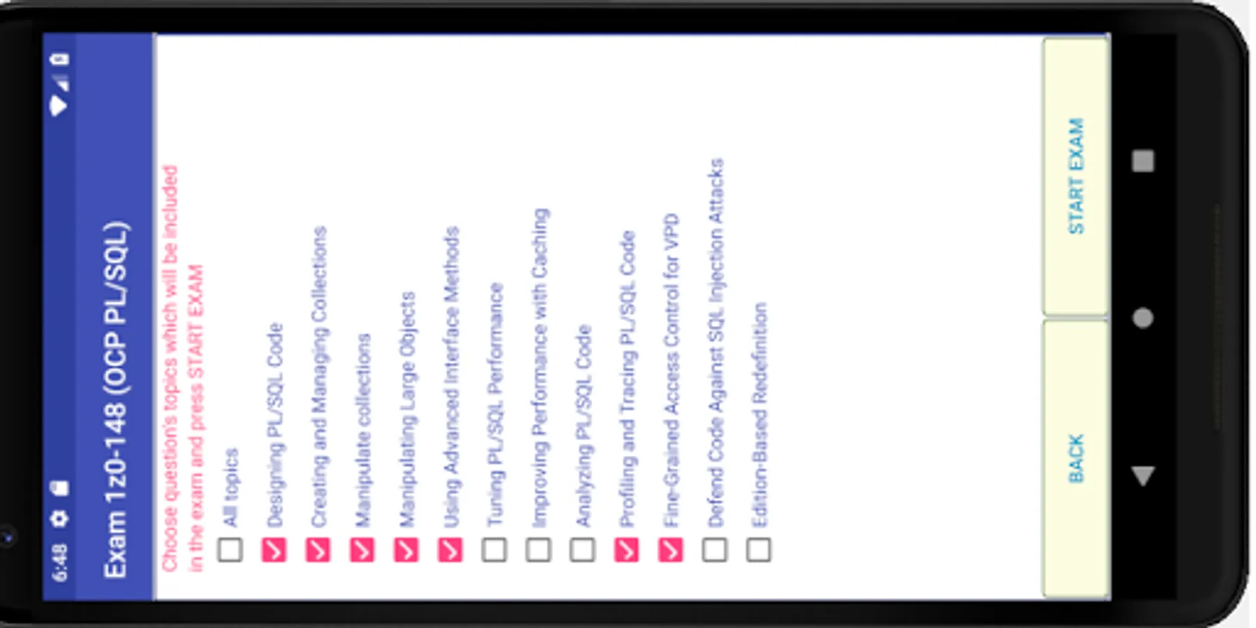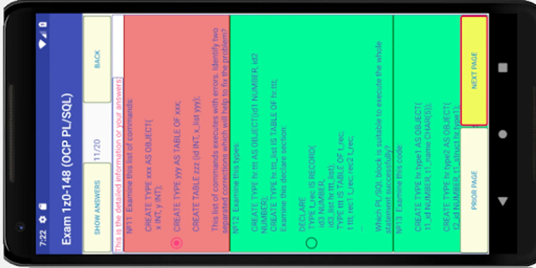 This application allows to prepare to take the 1z0-148 exam which is essential to obtain the advanced PL/SQL developer certificate (OCP). The application is a mobile analogy of the real oracle 1z0-148 exam but the questions in this application are more complicated. Some questions in this application will never appear in the real exam but they are necessary for deeply understanding PL/SQL programing skills. The application consists of 300 questions which are divided into 12 topics. Each topic includes 25 questions. It is possible to choose the questions specifying the concrete topics from the list.