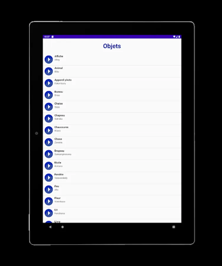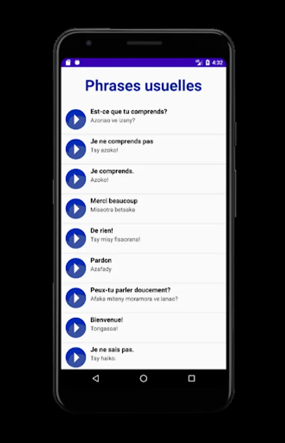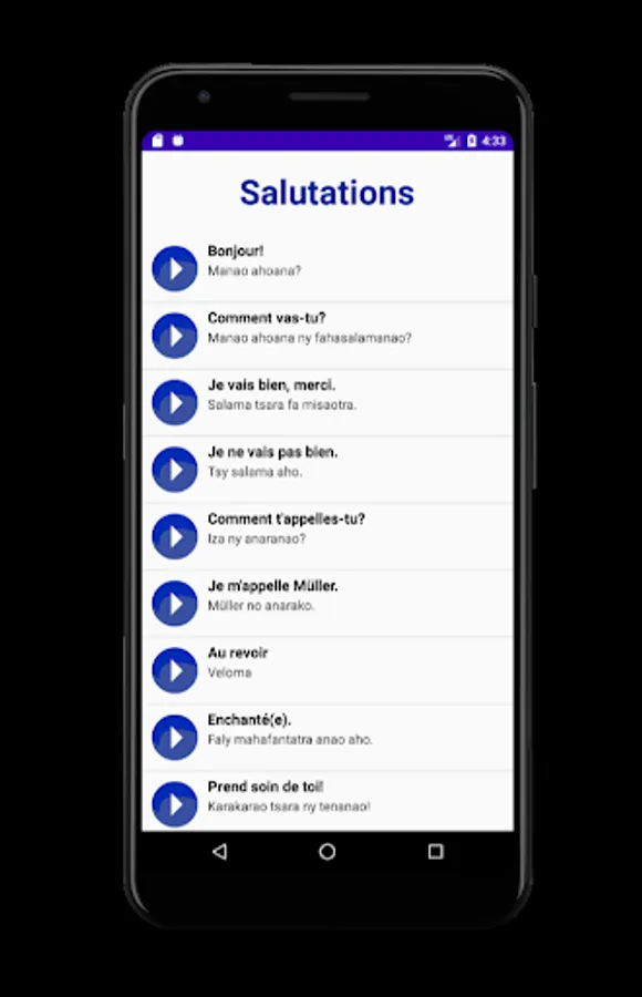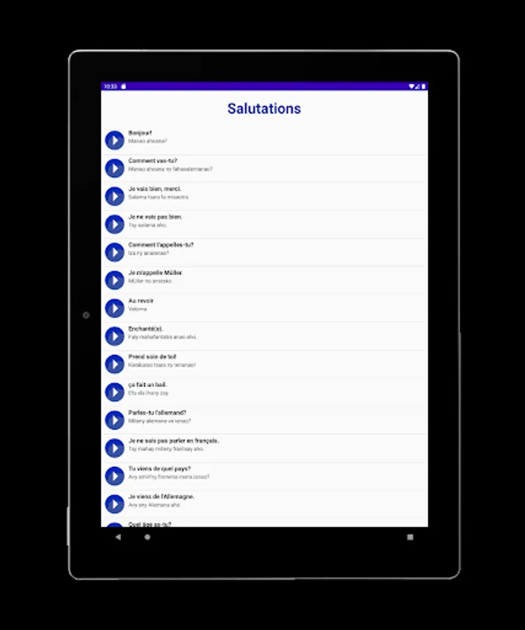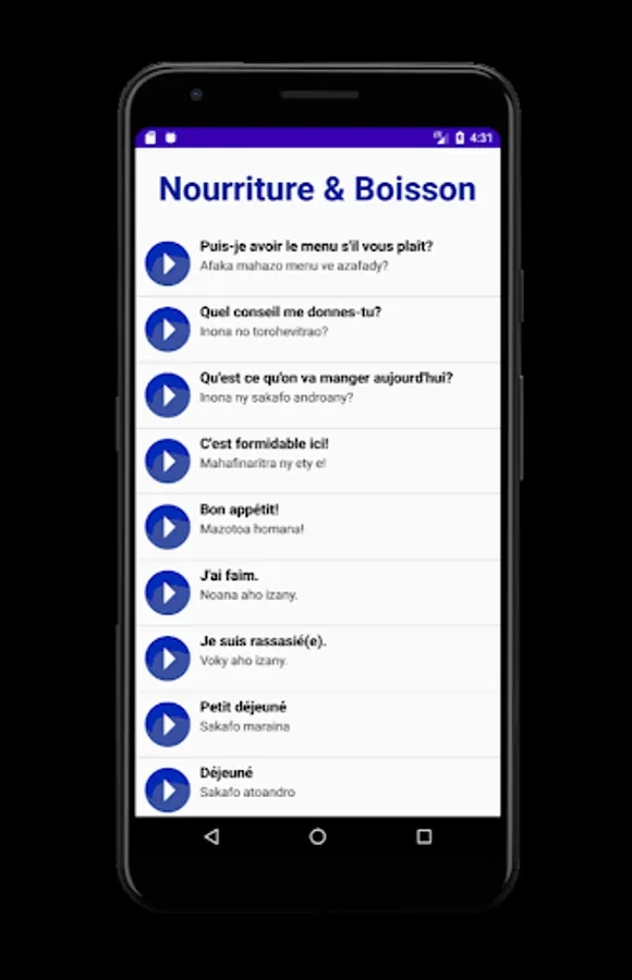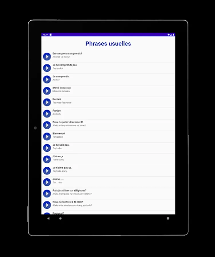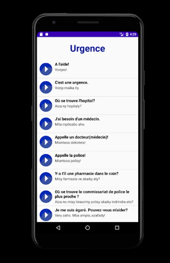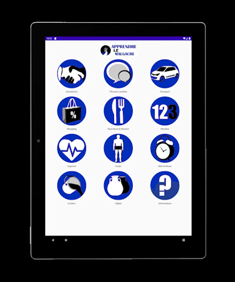 In order to facilitate the integration of a French speaker into Malagasy society, we have designed an application that is as simple as it is compact.