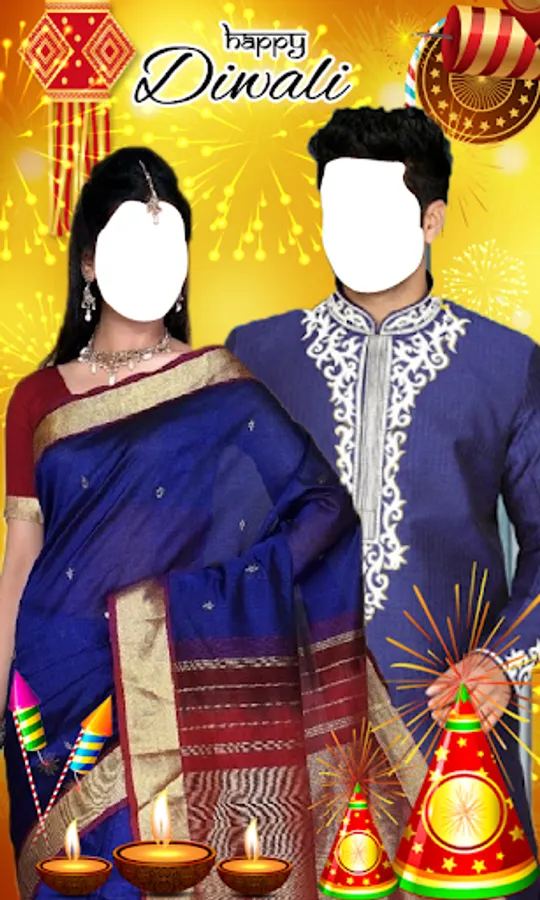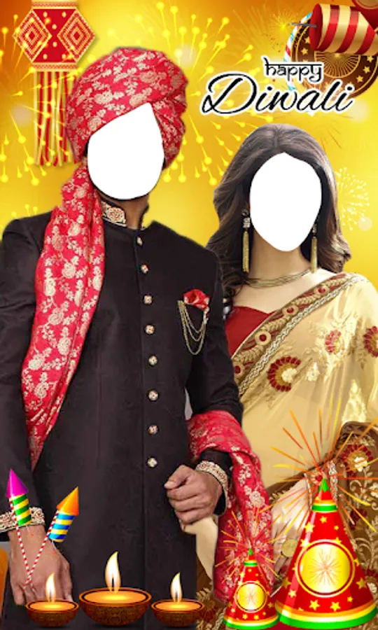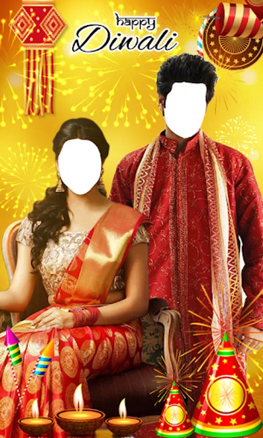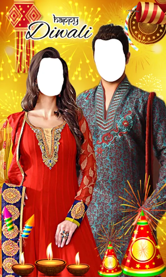 No event Indian event is complete without an ethnic wear and the most loved ethnic dress is diwali couple dresses. So to fulfill all those men's and women’s need who could not be able to wear sherwani, sarees, ghagra's this Diwali can also see how they could have looked it they would have tried we came up with this app “Happy Diwali Couple Photo Suit”.