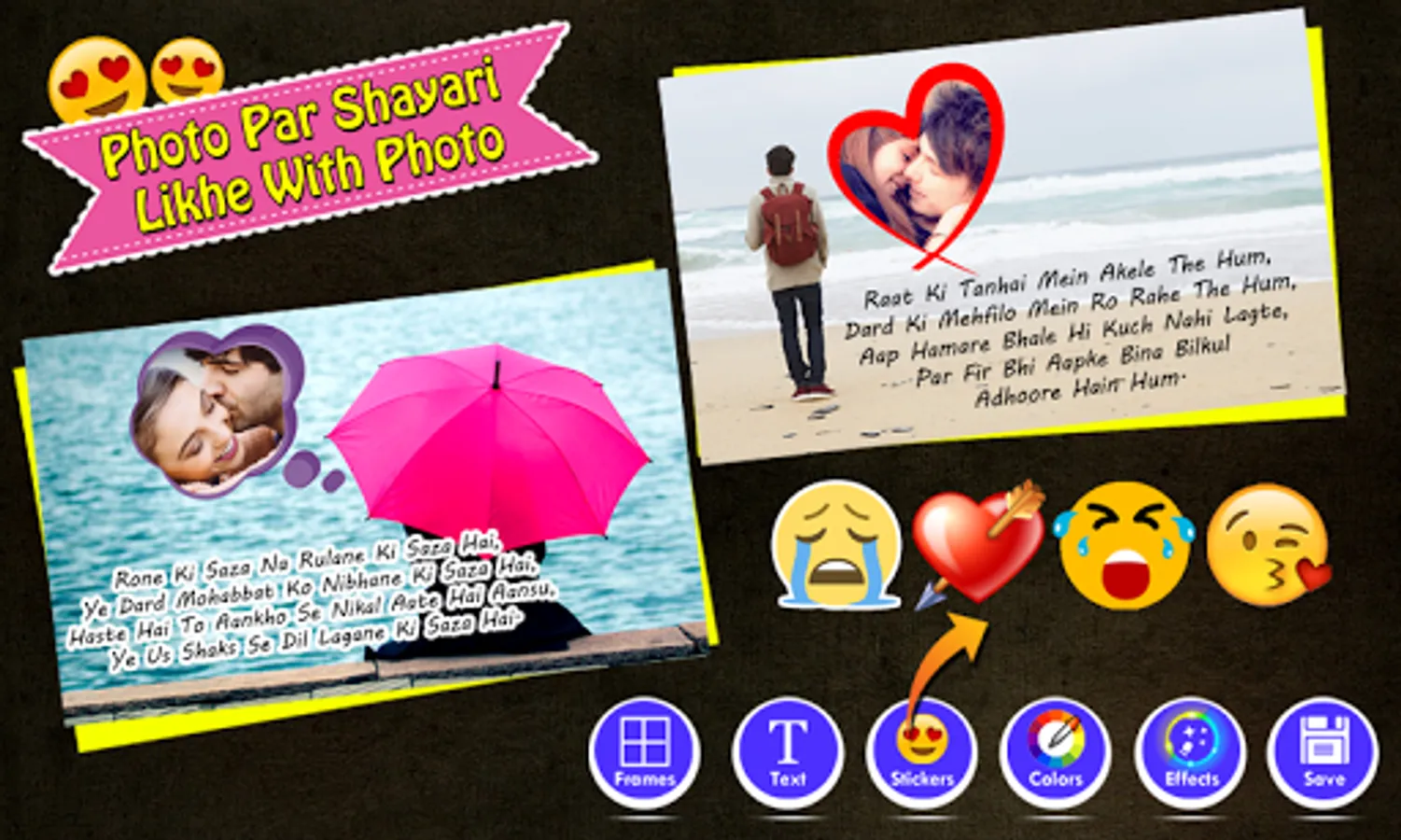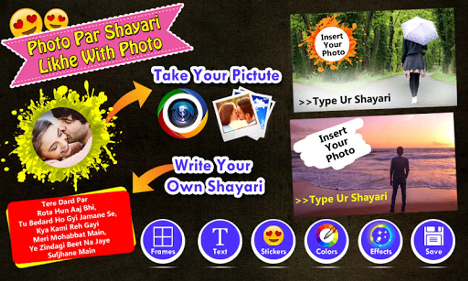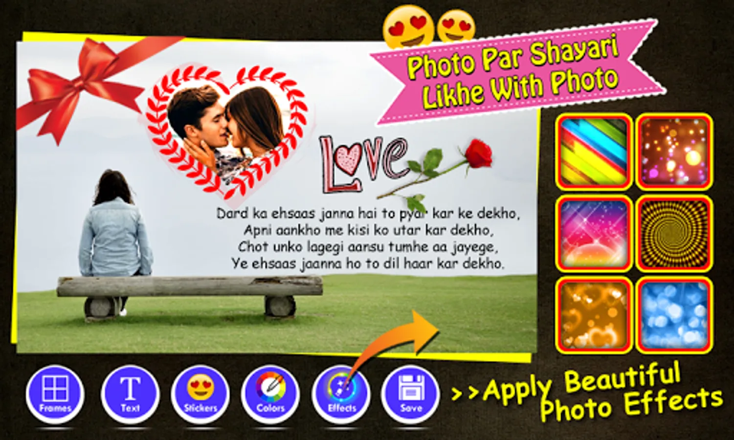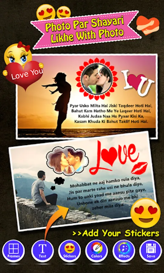 Select your favorite shayari photo frame and type your own heartful words. This app include lots of love stickers, text, color balance levels and overlay photo effects.