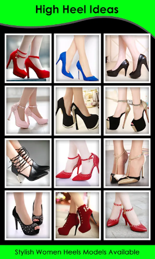 "High Heel Ideas" application shows a gathering of pictures about Fashion Shoes that you can seek in the market or you make as a thought in making Fashion Shoes. Women Fashion shoes speak to the vital area of the individual's particular necessities. Pondering what to wear? Discover furnish thoughts, shopping, and road style motivation to enable you to get dressed for work, dates, gatherings and more with "Women High Heel shoes Ideas ".
