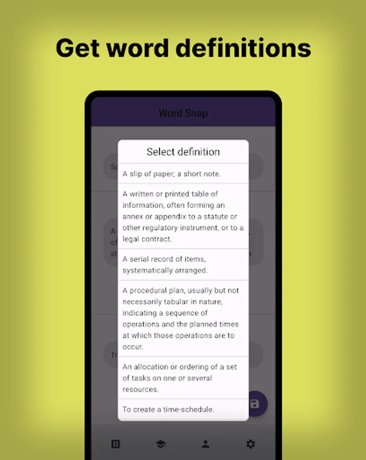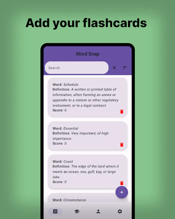 "Word Snap" is the ultimate app for language learners and vocabulary enthusiasts! With this app, you can create your own personalized flashcards by adding words and their definitions. You can either write your own definitions or choose from the in-built online dictionary, making it easy to create comprehensive and accurate flashcards.