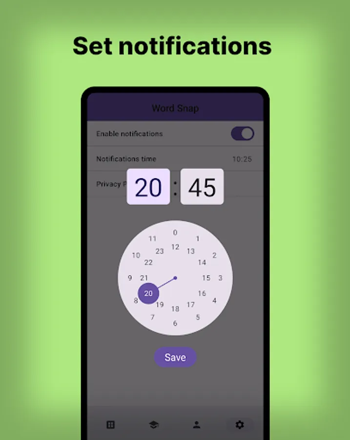 Using "Word Snap" you can backup and restore your data to the cloud, ensuring that you never lose your valuable flashcards. Additionally, you can set daily notifications to keep your learning on track and choose the time that works best for you.