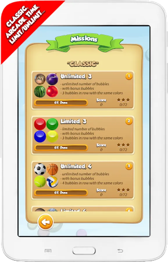 - Classic, Arcade, Time Limit, Bubbles Limit, 3 and 4 Bubbles combinations;