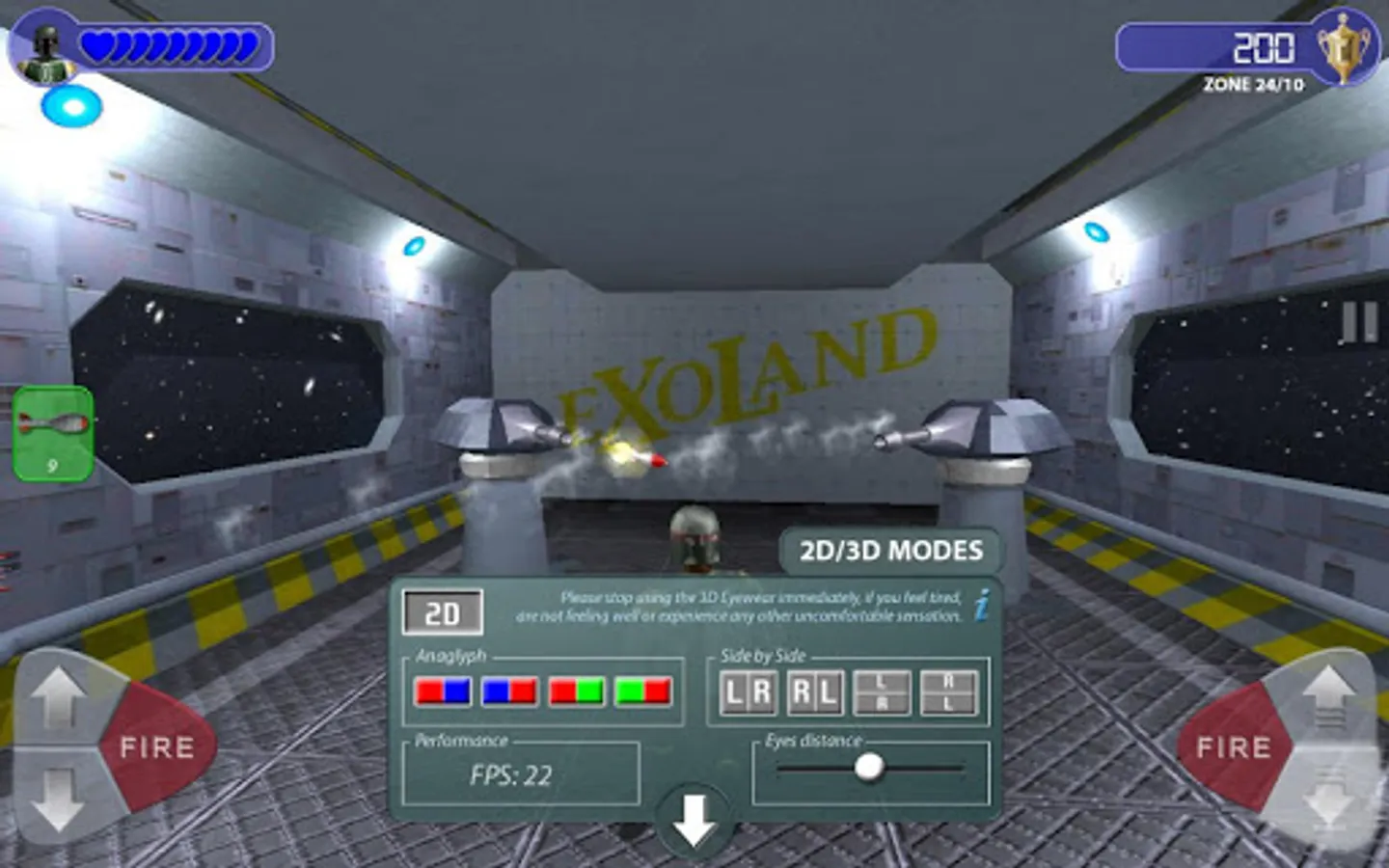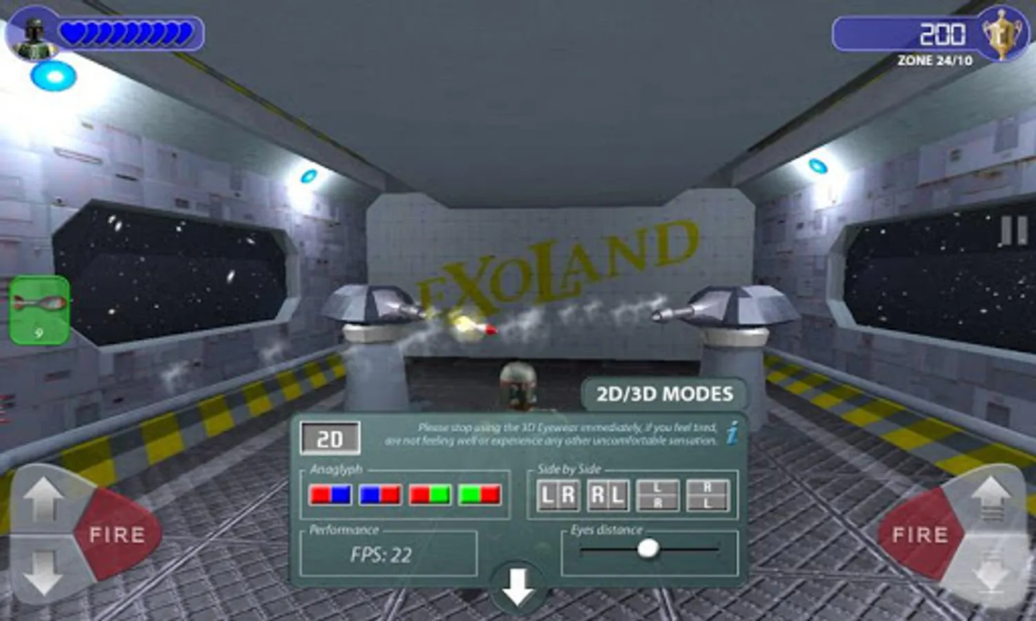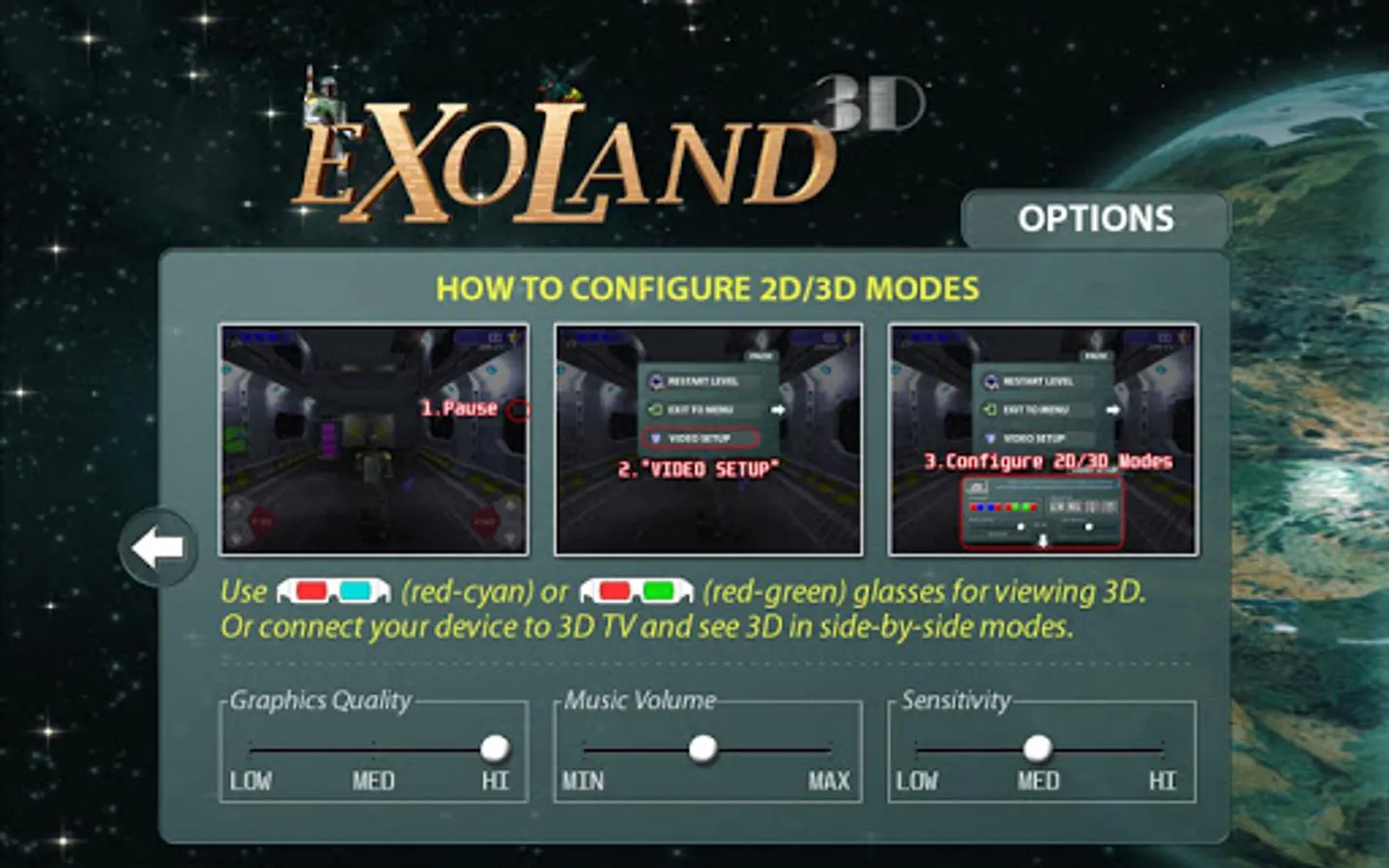 You can use anaglyph glasses (red-cyan or red-green) or connect your device to 3D TV (side-by-side) and enjoy realtime 3D game.