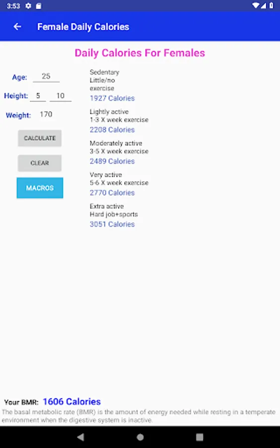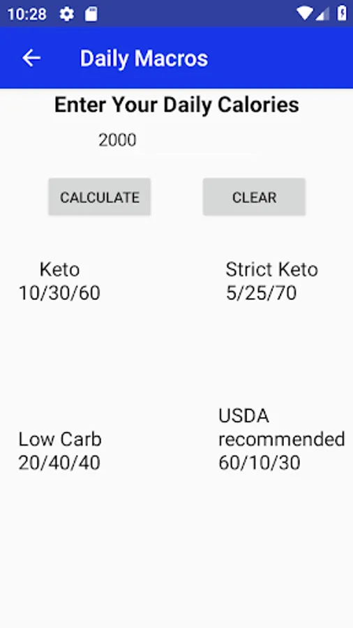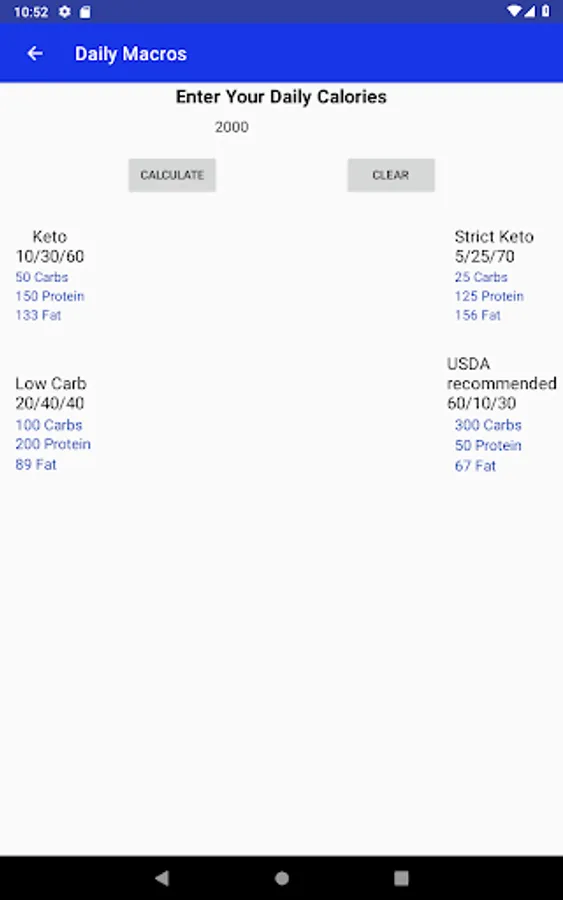 -New: Added Keto and Macro calculators .Know how many calories you allowed to consume! Calculate how many carbs , protein and fat you can consume while on Keto , Strict Keto , Low Carb and USDA recommended diet .