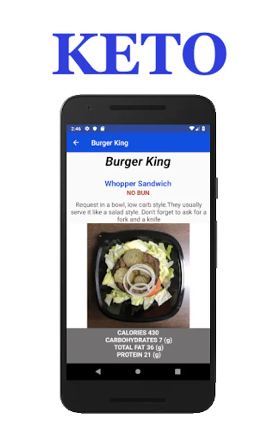 - App shows Keto diet approved meal items that you can order from popular restaurant chains the Keto way
