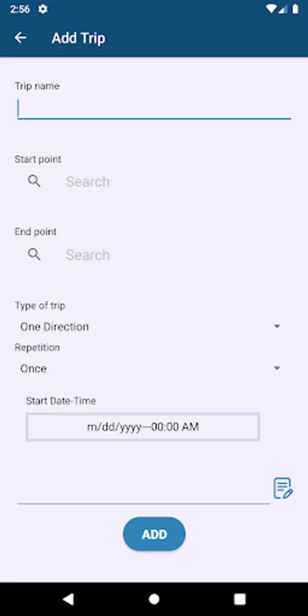 Add Trip: It provides you an easy way to add your trip to a schedule, to choose the type of your trip, to choose how many times you want to repeat your trip, add notes to your trip.