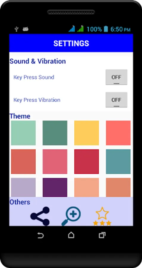 1. Settings: sound, vibrate, and options to select English keyboard layout.