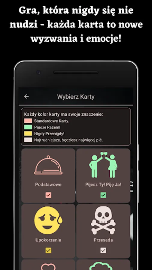 You don't need any special hardware to play this game - all you need is your phone. The rules are simple - each card represents a different task that must be completed by the person who draws it. These tasks are varied and always related to drinking, which makes the game even more interesting.