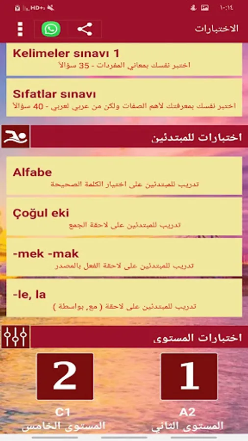 #Tests: A section contains the following sections: Training tests, which are tests of multiple choices, and tests for beginners, which are training exercises to choose the correct word, and level tests, which are tests according to your level in the Turkish language, arranging sentences, which are short tests of multiple words to arrange them in sentences Hearing tests, which are audio tests that listen to the sound and then answer, the appropriate title, which is a set of texts for which you choose the appropriate title.