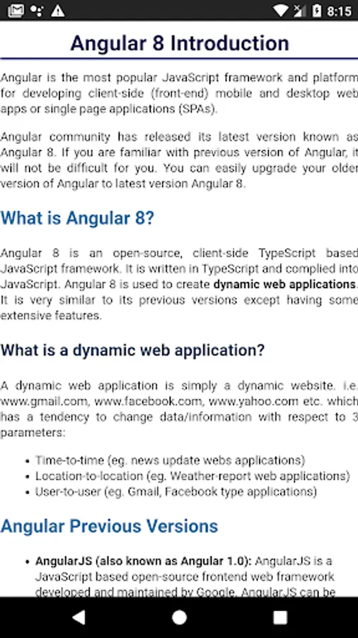 Angular is an open source JavaScript framework for building web applications and apps in JavaScript, html, and Typescript which is a superset of JavaScript. AngularJS is a very powerful JavaScript Framework. It is used in Single Page Application (SPA) projects. It extends HTML DOM with additional attributes and makes it more responsive to user actions. AngularJS is open source, completely free, and used by thousands of developers around the world. It is licensed under the Apache license version 2.0.