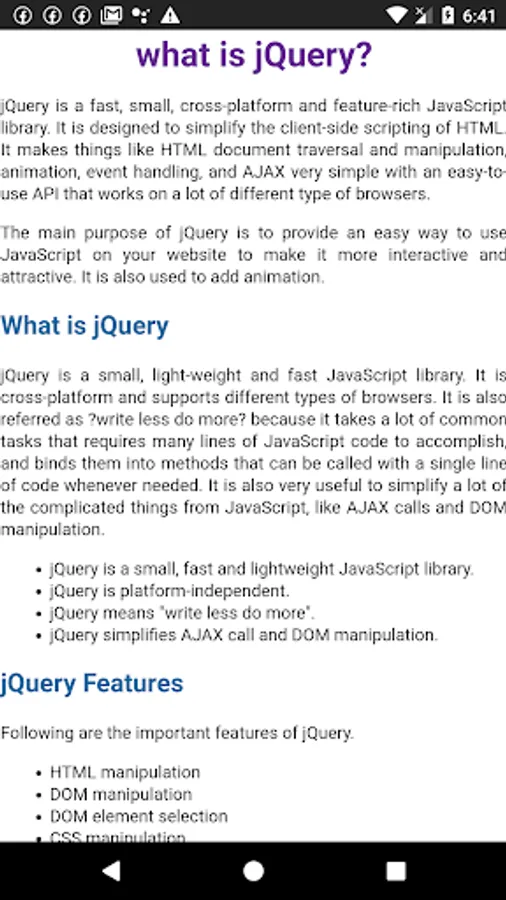 This tutorial is designed for software programmers who wants to learn the basics of jQuery and its programming concepts in simple and easy ways. This tutorial will give you enough understanding on components of jQuery with suitable examples.