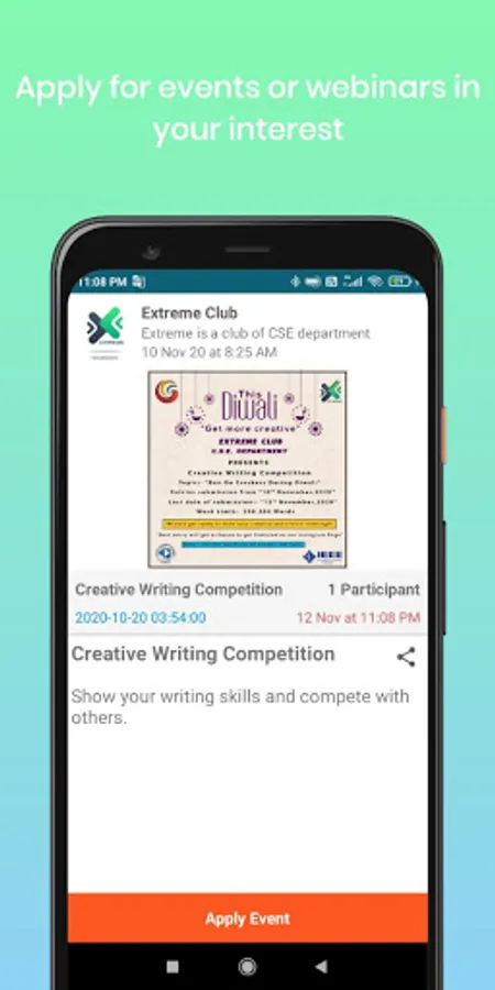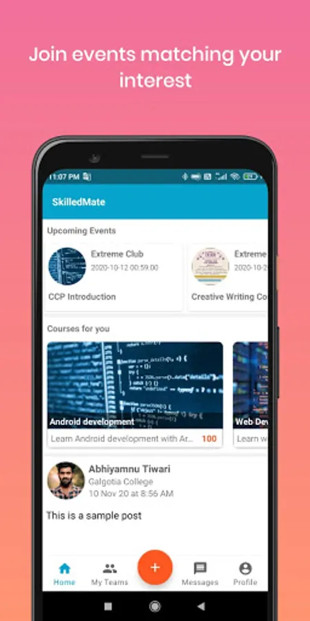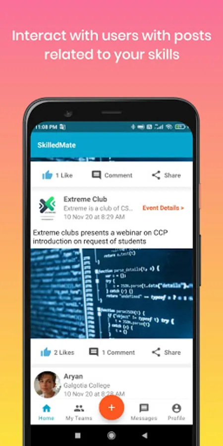 Skilled Mate is an Android app developed for connecting people based on their skills and interest in any fields.There is a Upcoming Events section in the app which will show all the public events of the Team/Club or the private events of the clubs if the user is follower/member of the Team/Club. Users can create posts that can contain only text, Image or Image and text both. Posts will be shown to users on the basis of their skills or interests. Creating Teams helps teams to organise teams and post events to gain more participants. Users can join teams and participate in various events and can learn skills together. Interested users can also create courses to teach others their skills either for money or free. Our app will provide you a place where you can explore courses and can contact the owner through our real time chat to learn more about it. Users as well as Teams can chat in real time and can share photos and files.
