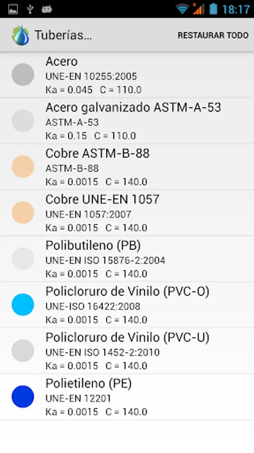 There are series of steel pipes (EN 10255:2005), copper (UNE-EN 1057:2007 and ASTM-B-88), polyvinyl chloride PVC-U (EN ISO 1452-2:2010) and PVC-O (UNE-ISO 16422:2008), polyethylene PE (EN 12201) and polybutylene, PB (EN ISO 15876-2:2004).