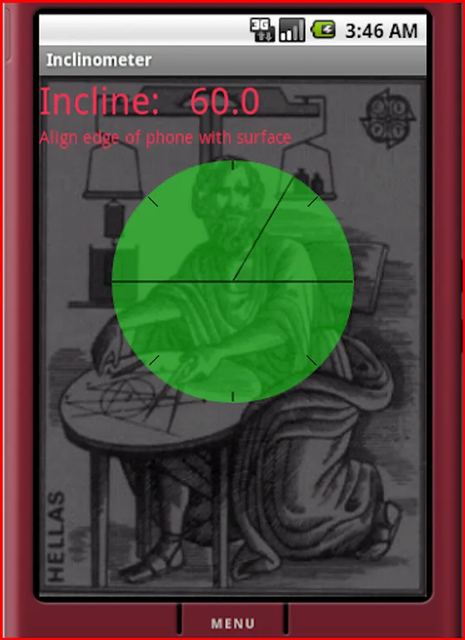 Shows the angle of incline from horizontal. Useful if you need to measure the slope of a surface with gravity or level a picture. Offers a beep option - silence when level, faster the farther from horizontal.
