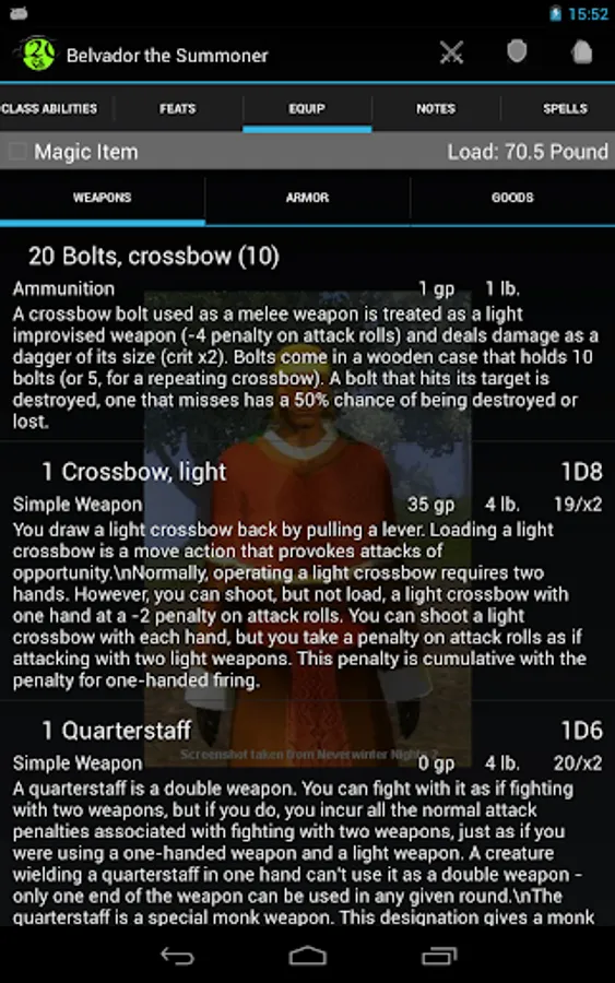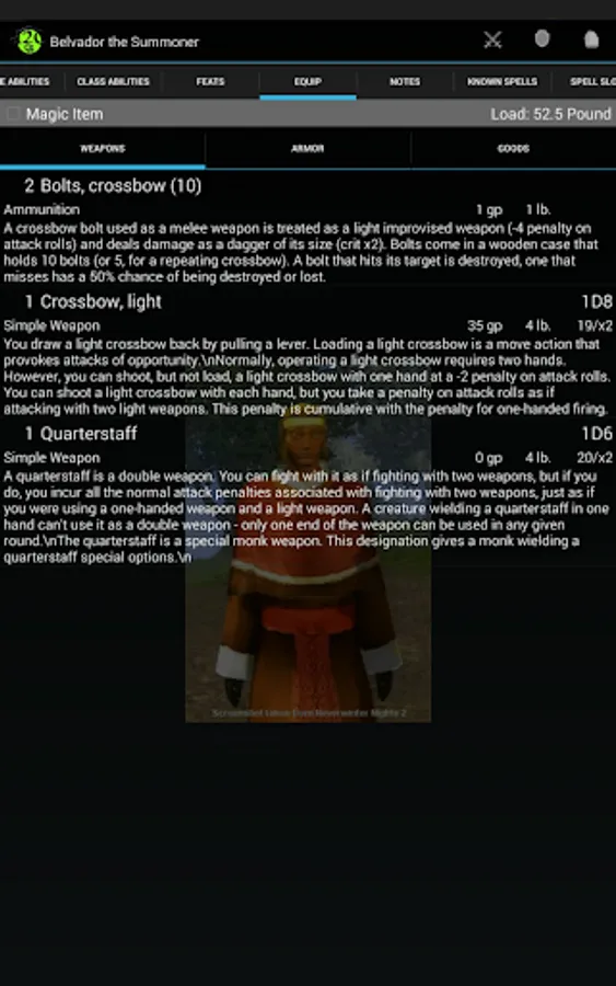 * Weapons, armor and goods are listed with detailed information, like cost and weight