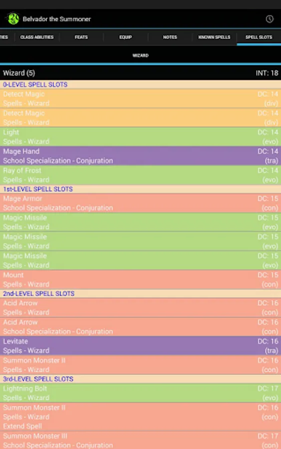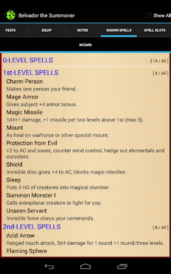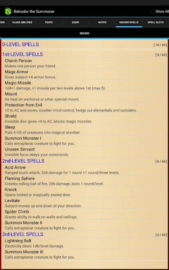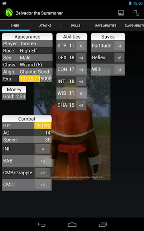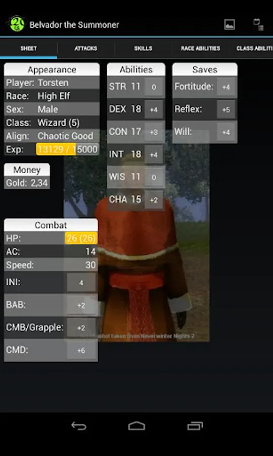 * Name, Player, Race, Sex, Alignment, Class, Level and Experience Points