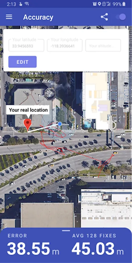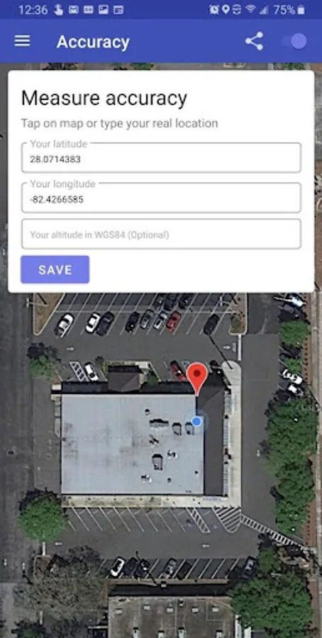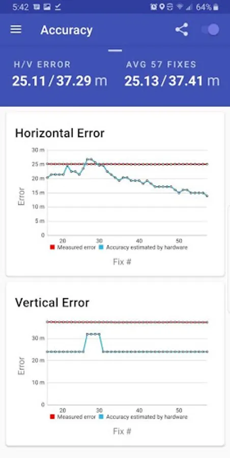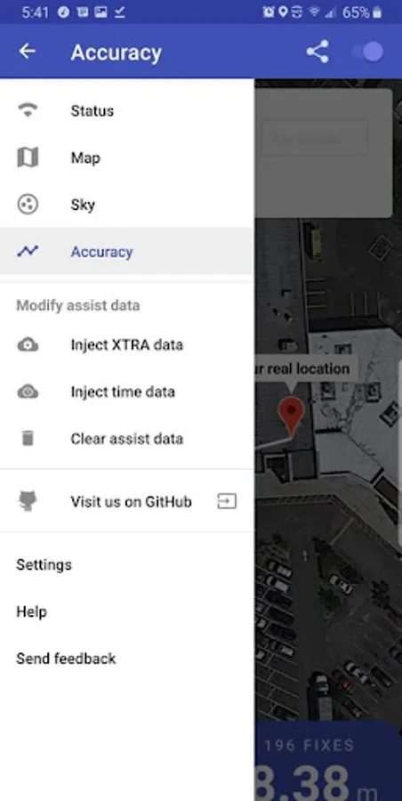 The "Accuracy" feature lets you measure the error in your device's position against your *actual* location (entered by you). Other apps show you the *estimated* accuracy, which is generated by your device. GPSTest lets you to compare this estimated accuracy to *actual* accuracy!