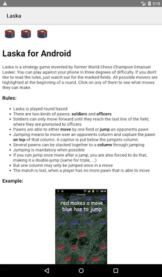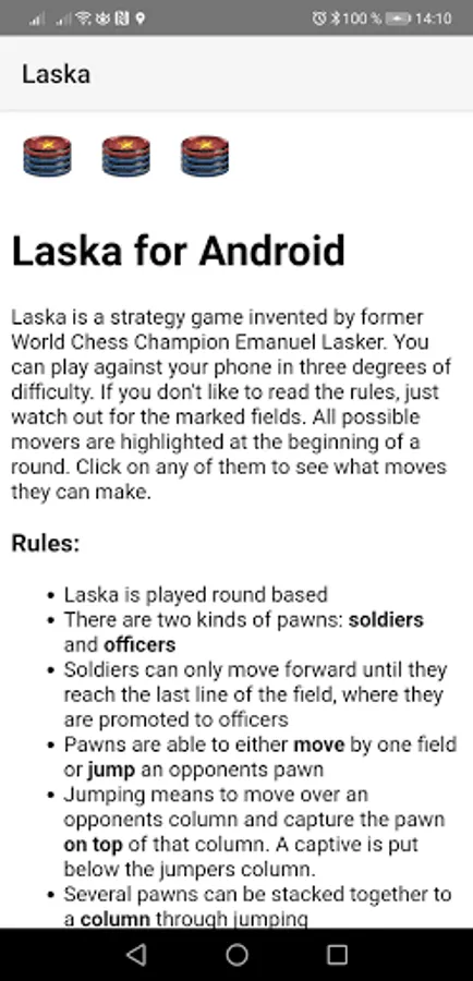 You will learn quickly by playing because Laska guides you inside the game. It indicates the possible moves and gives you hints when a certain action is against the rules.