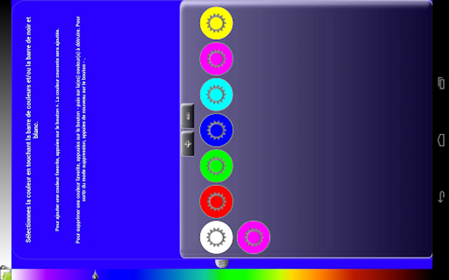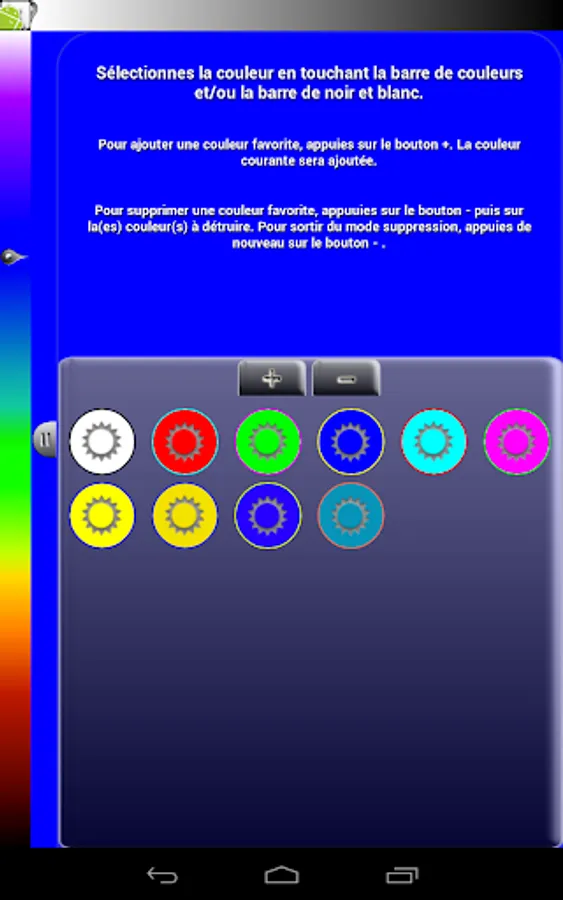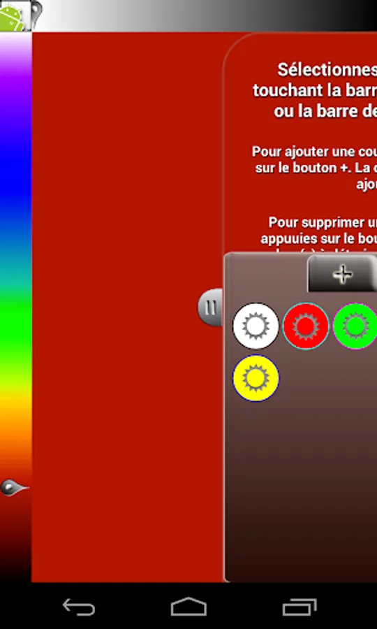 MyLight is a simple application that allows you to change your screen into a light. Moreover MyLight lets you choose the color displayed by the screen, need a bright light go for the white, need to check if the new kid sleeps, opt for red, need a mood light, just choose it. You can save your favorite lights in a sliding drawer that opens easily and quickly and let you display it again.