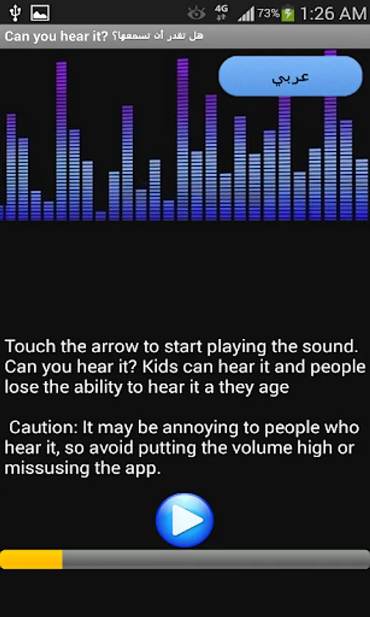 هذا التطبيق للإستكشاف و التسلية فخذ الحذر من إزعاج غيرك و بالذات الأشخاص الأقل عمرا كالأطفال وينصح بوضعه بعيدا عن الأذن.المطور ليس مسؤولاً عن سؤ الإستعمال.