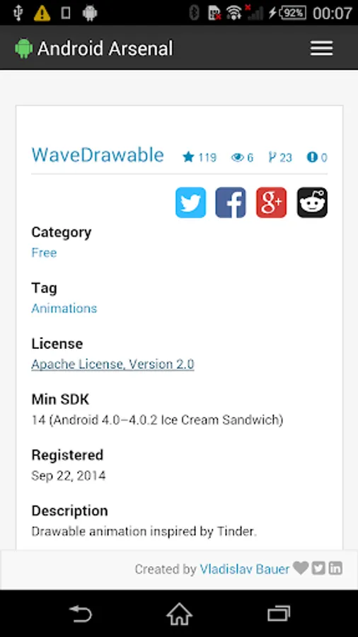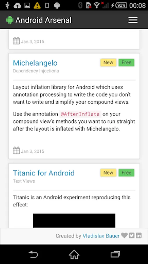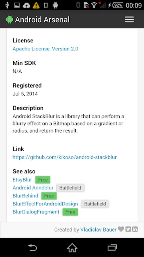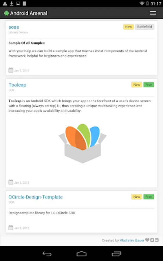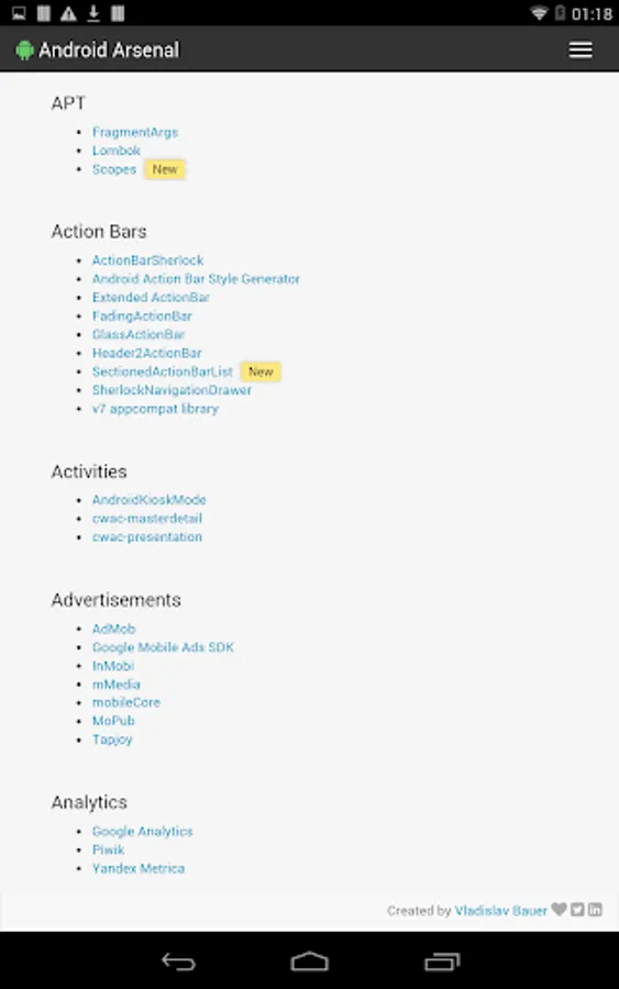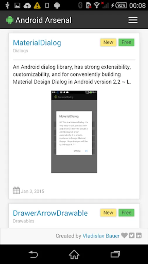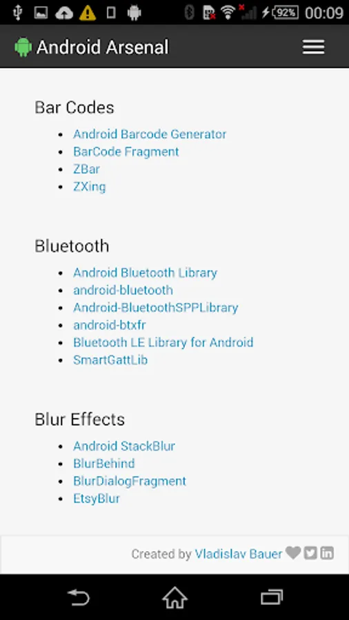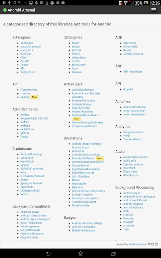 This simple application wraps the official web site (https://android-arsenal.com) to allow an easy access from Android devices. Application provides a collection of libraries, tools and projects for Android developers.