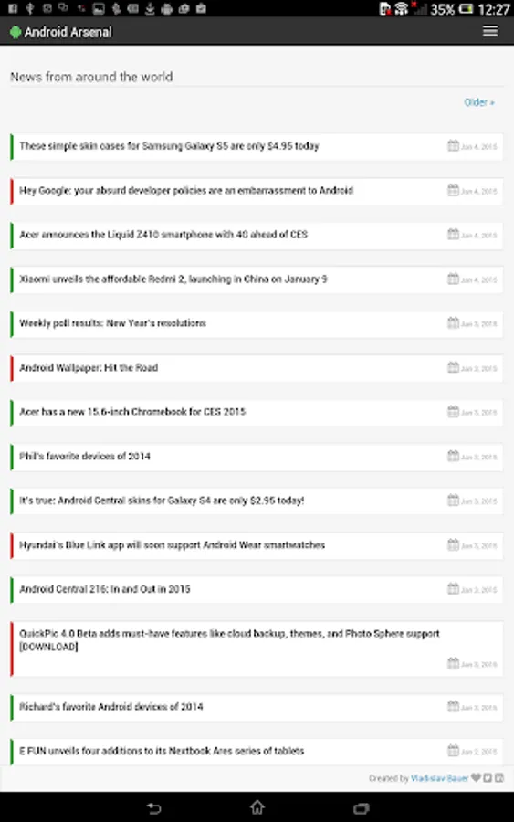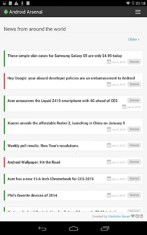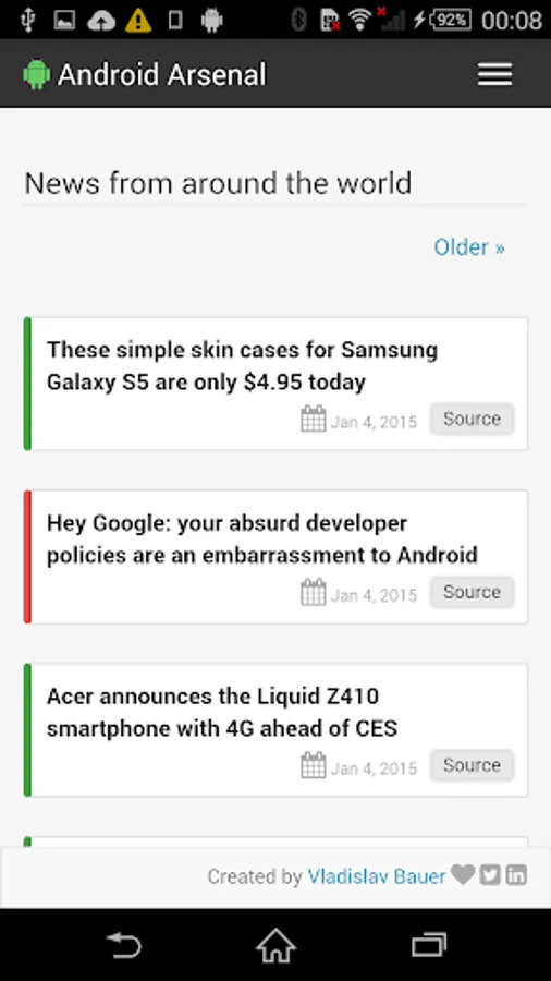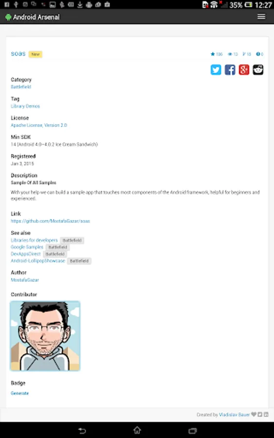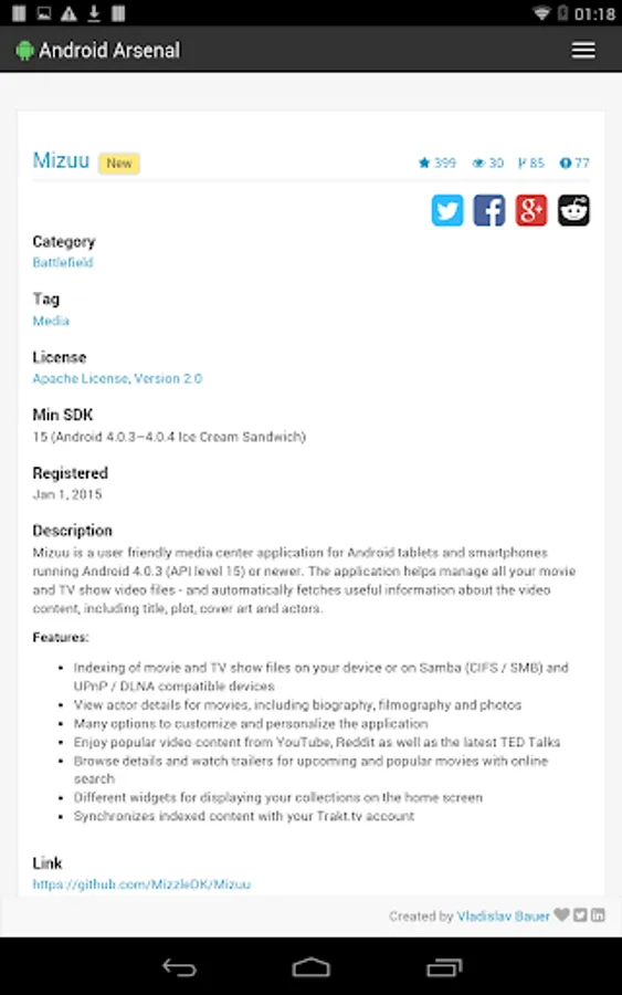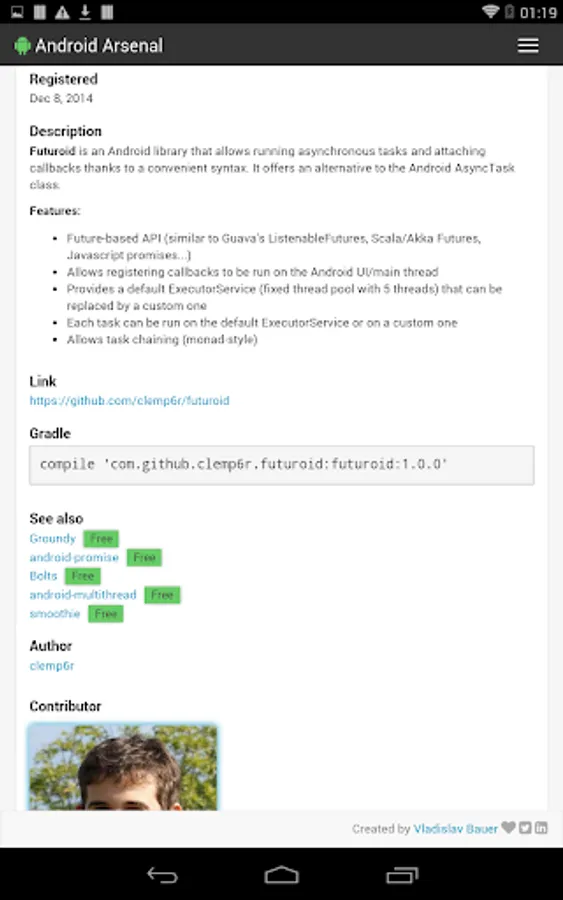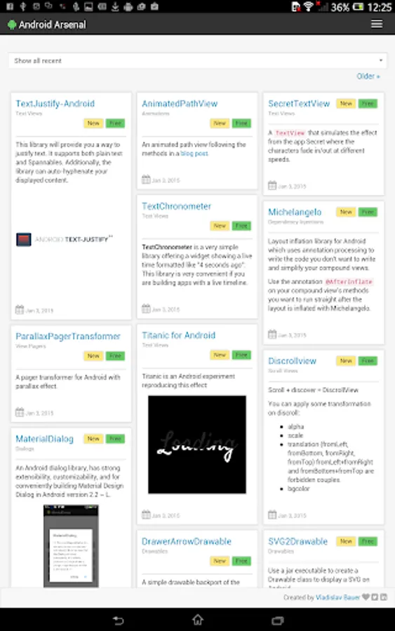 This simple application wraps the official web site (https://android-arsenal.com) to allow an easy access from Android devices. Application provides a collection of libraries, tools and projects for Android developers.