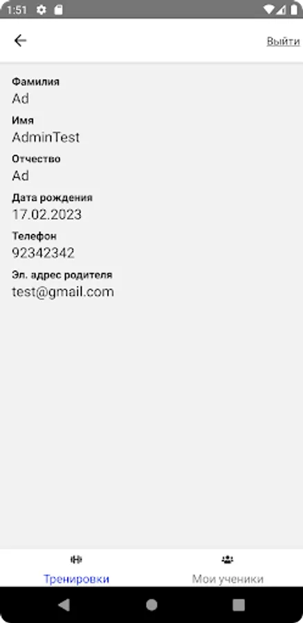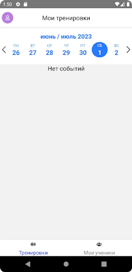 Application for trainers. The application shows the available arena schedule, the coach can add to his personal schedule: workouts, record students, transfer and delete workouts, add students to group workouts.