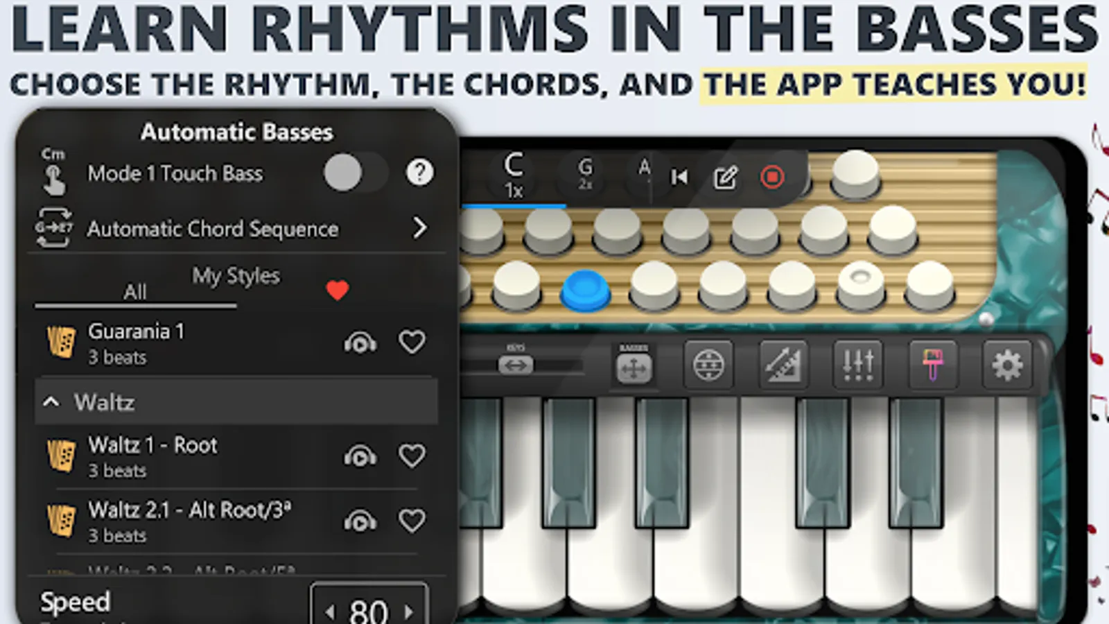 Learn about the accordion basses with our unique system of "Automatic Rhythms" - With this you can make a sequence of chords, choose a rhythm, and the application will automatically execute it on the accordion basses, while so you can train their melodies and harmonies, and can learn new rhythms in the accordion basses, all with compass measurement at the correct time.
