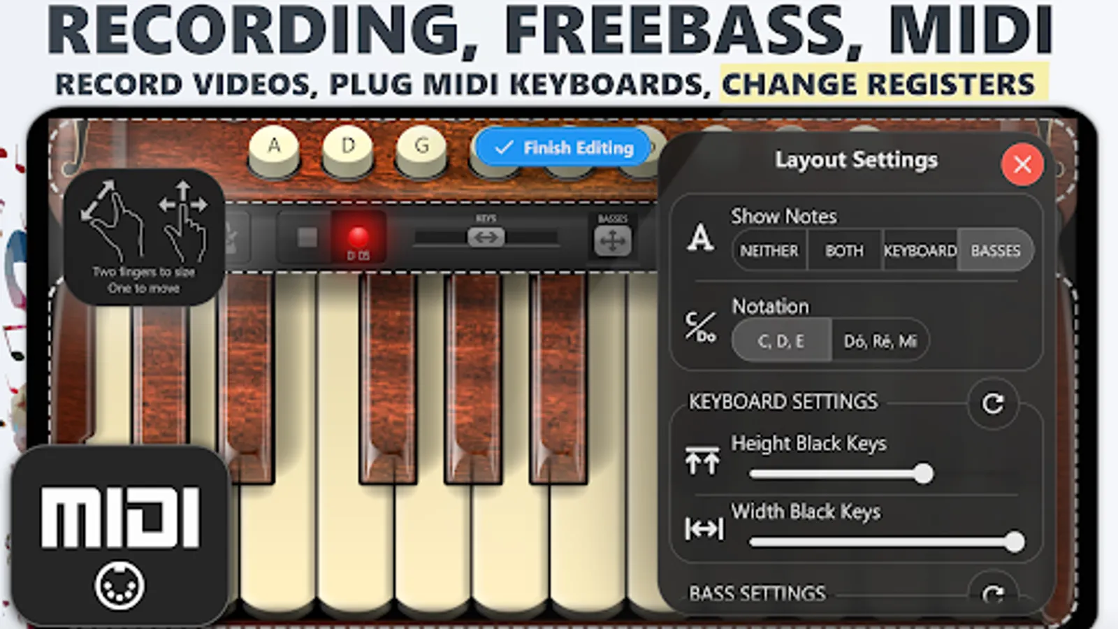 * Highly Customizable Layout. Set the size of the keys, basses and keyboard positions, disposition inclination of the basses, the distances between them, and other possibilities.