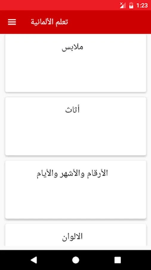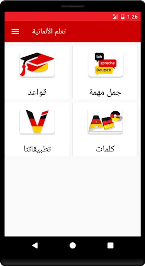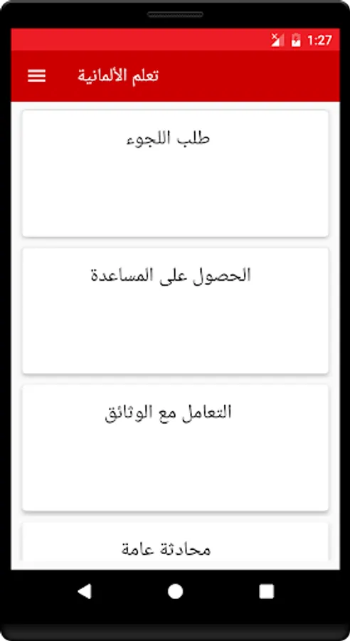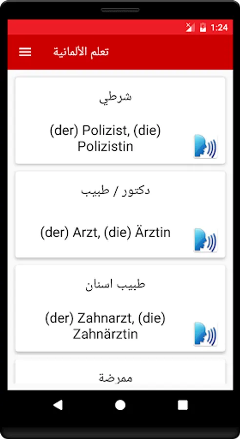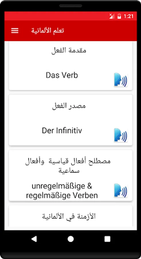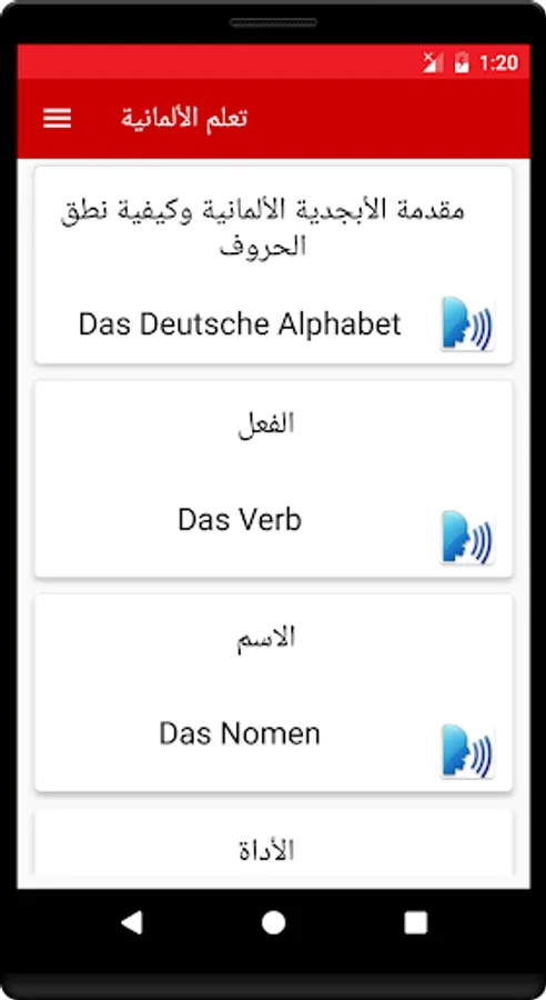 The application help you to learn and study german language in Arabic from the pronunciation of letters and sections and sentences for beginner up level B2 from professor Dr. Bahar Bakar as well as a wide range of words and common sentences with pronunciation in many areas such as health, education, asylum, Colors, weather, dealing with documents, trade, food and many other fields.