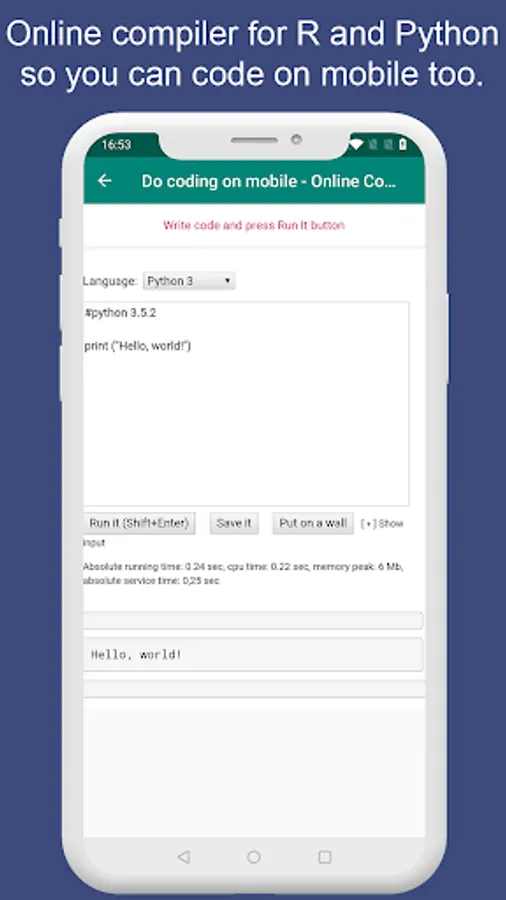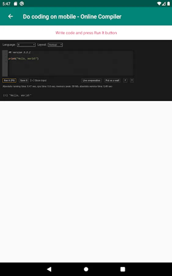Online compiler on Mobile device, you can write code on mobile and run it to see output.