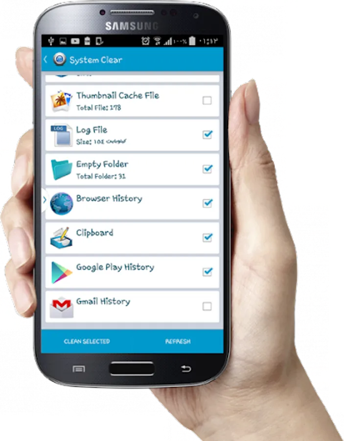 . System Clean(Cache, Thumbnail Cache, Temporary File, Log File, Empty Folder, Empty File, Browser History, Clipboard, Market History, Gmail History, Google Earth History, Google Map History)
