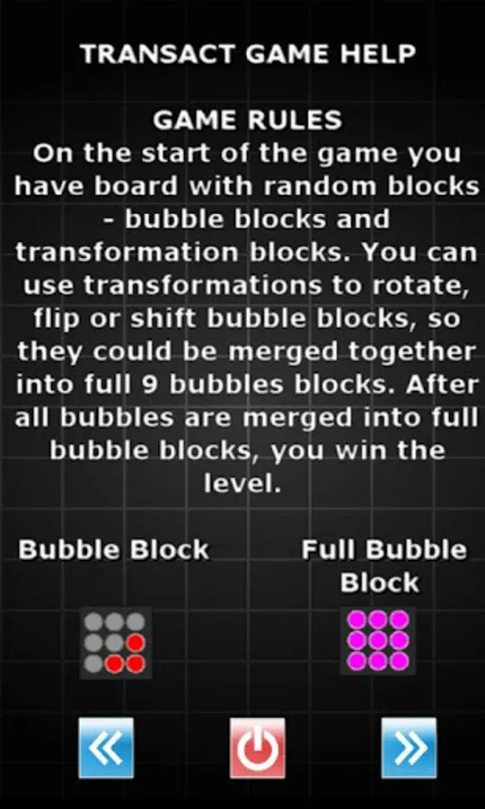 Transact is a brain teaser game where you need to move together bubble blocks by using various moves and rotations. (Its similar for example to game Retreat.) To resolve puzzle you need to combine available movement blocks in specific order so you fit all bubble blocks together.